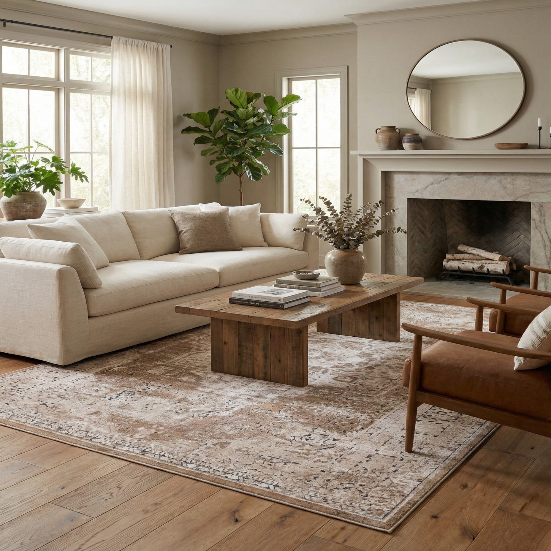 This rug works well as an anchor in a relaxed living room beneath a sofa and coffee table, layered under a wooden dining table to add warmth, or placed in a bedroom to soften hardwood floors and tie neutral bedding into the scheme. It complements warm wood tones, soft gray upholstery, and navy accessories, and suits transitional, coastal, or modern farmhouse interiors that favor muted, adaptable palettes.