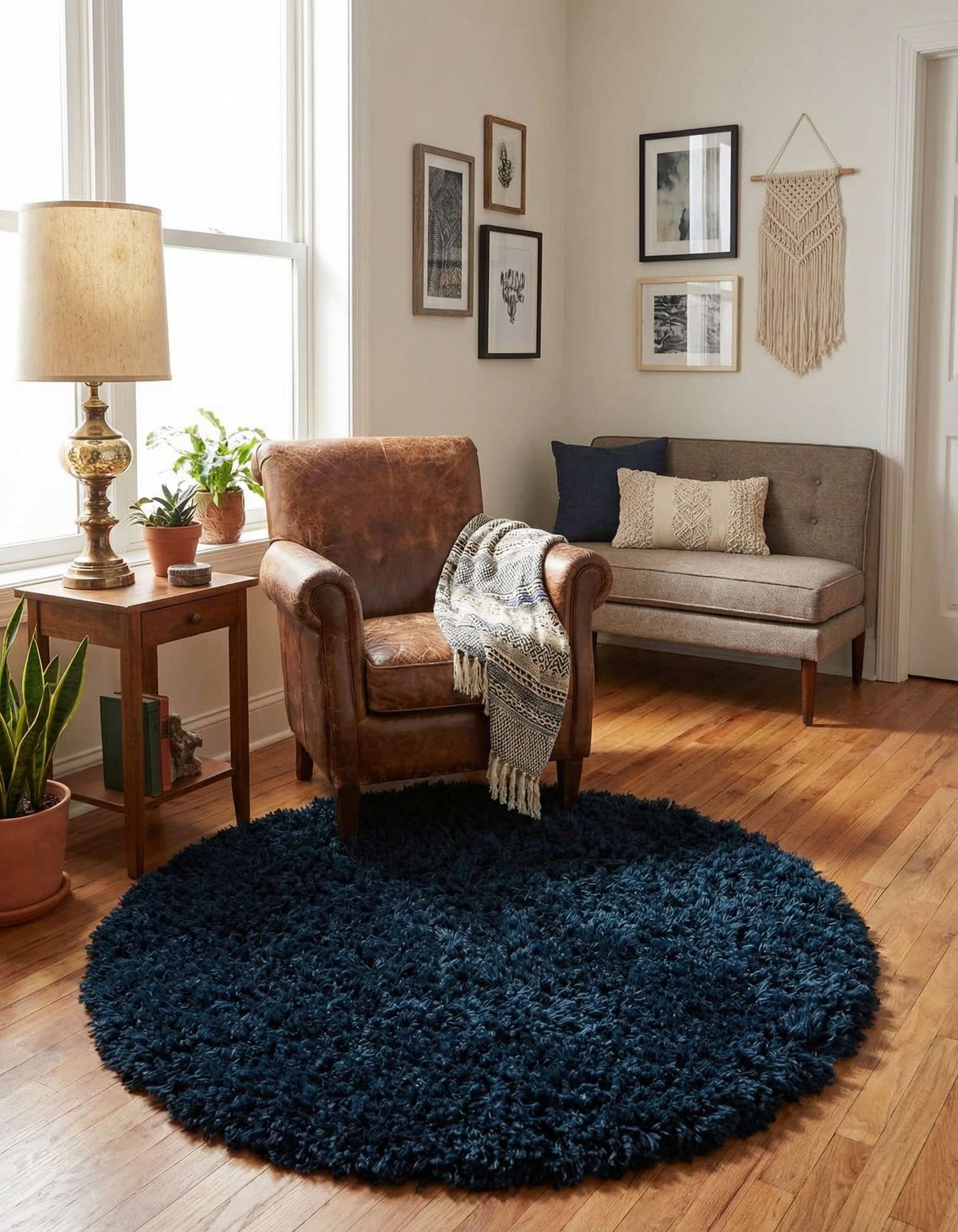 This piece works well as a cozy anchor in a reading nook or beside a low-profile bed, or layered under a small round coffee table to add tactile contrast to hardwood floors. Pair it with warm wood tones, cream linens, and brass or black metal accents for a contemporary, coastal, or mid-century inspired scheme. It also makes a comfortable statement in a teen’s bedroom or a relaxed living area where color and texture are the focal points.