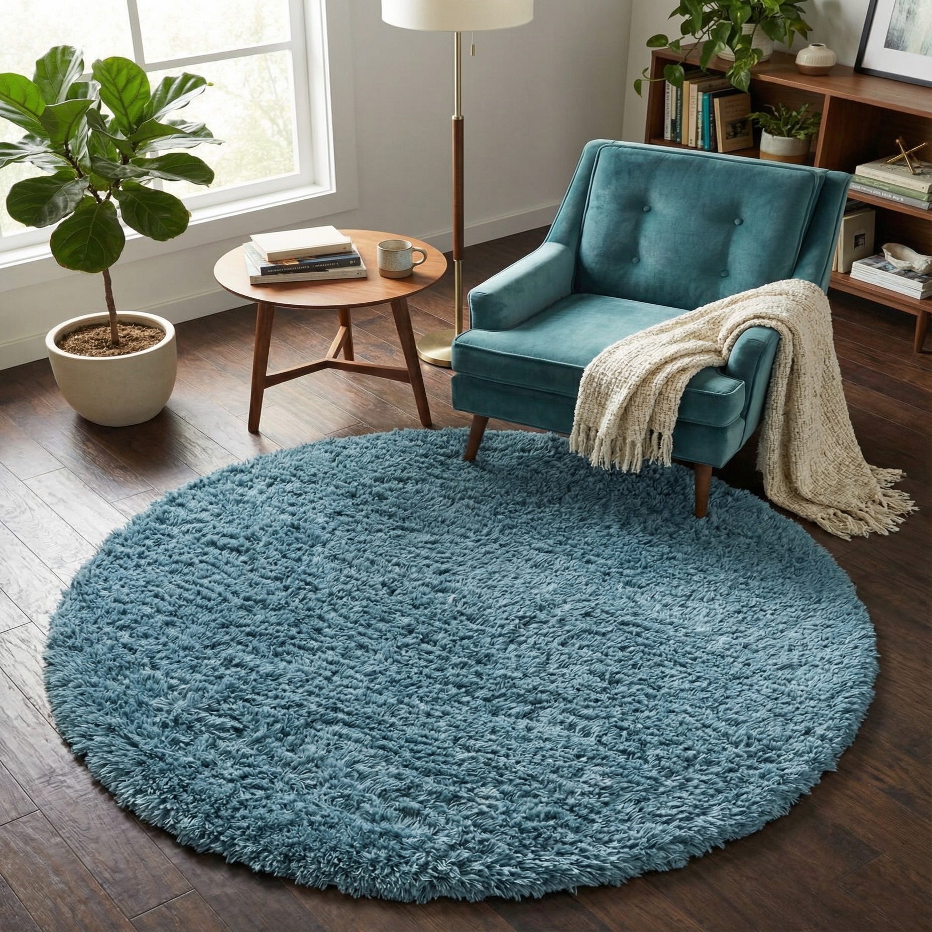 Machine-made from 100% polyester, this rug offers a soft, resilient pile suited to everyday living. It works well beside a bed or in a reading nook, layered under a small round table, or as a color anchor in a coastal, contemporary, Scandinavian, or mid-century modern scheme. The round silhouette and plush feel bring warmth and casual comfort to relaxed living rooms, bedrooms, nurseries, or entry areas.