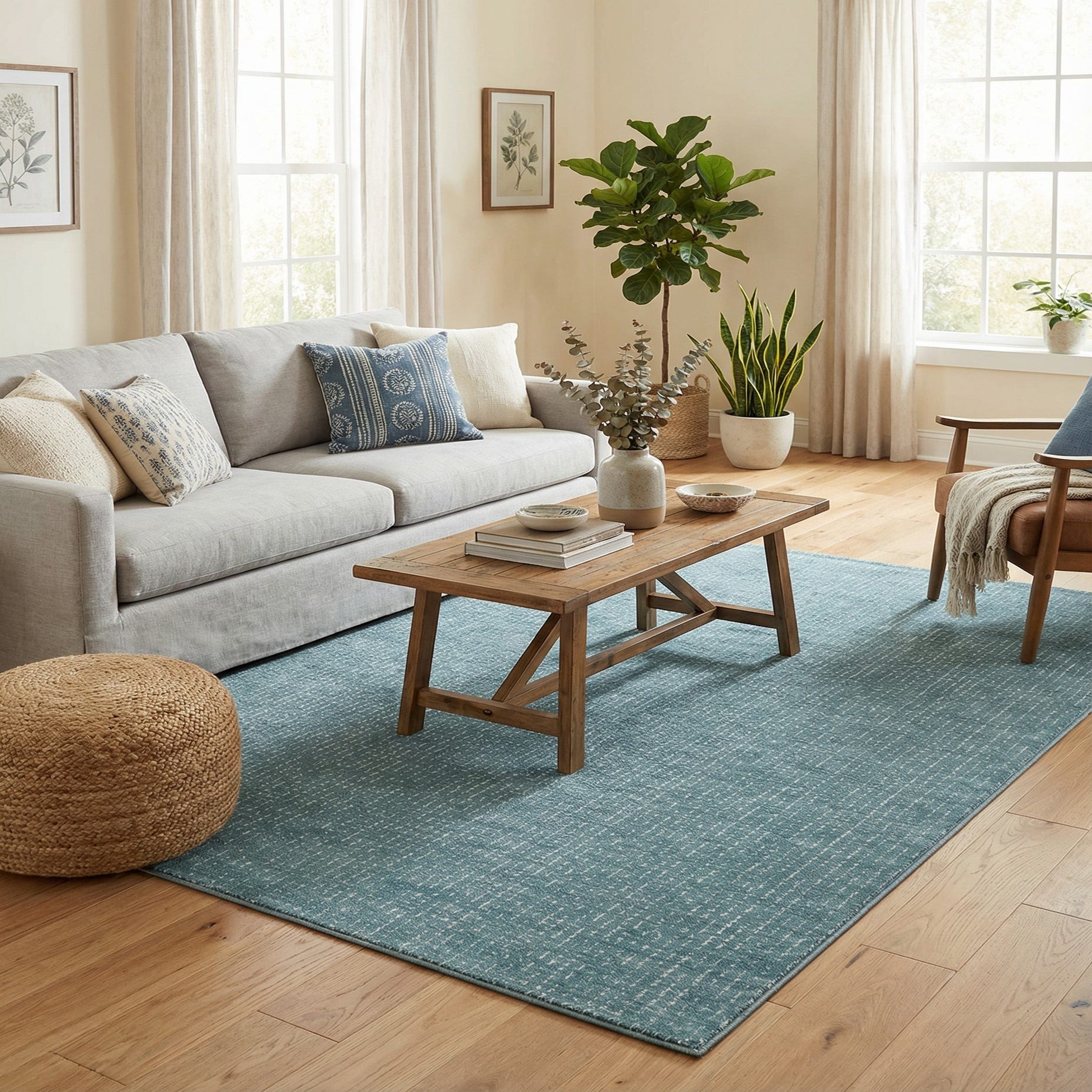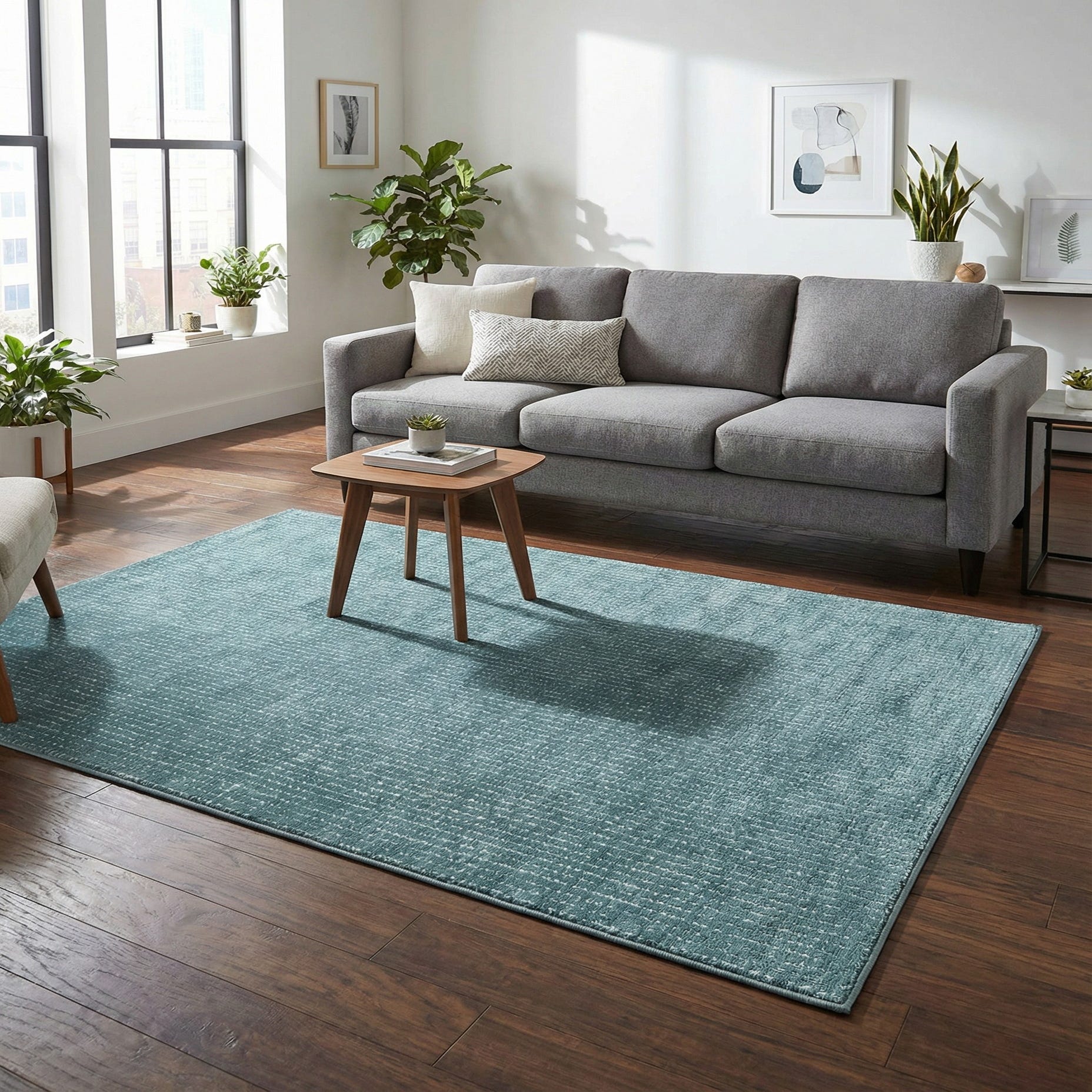 This rug works well in a coastal or contemporary living room, layered beneath a small seating area, or placed at the foot of a bed to add color and softness. It pairs easily with natural wood tones, light-grain oak furniture, and linen or neutral upholstery for a balanced, tranquil palette, and it will also complement crisp white cabinetry or matte black accents in a home office or entryway. The restrained pattern and tactile chenille surface make it a good choice for spaces where you want subtle interest without overpowering other elements.