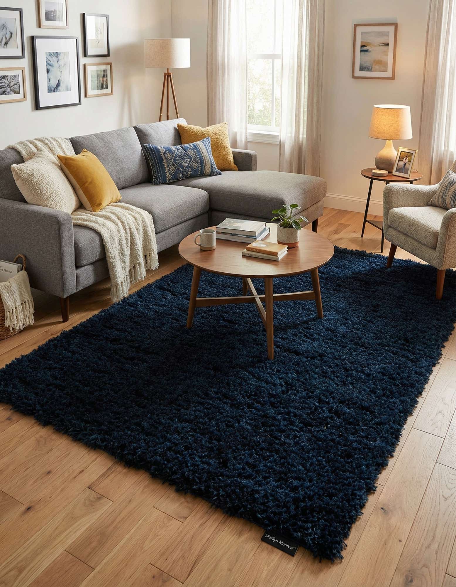 A plush, rectangular 4x6 navy blue shag rug with a deep pile, perfect for adding comfort to a living room or bedroom.