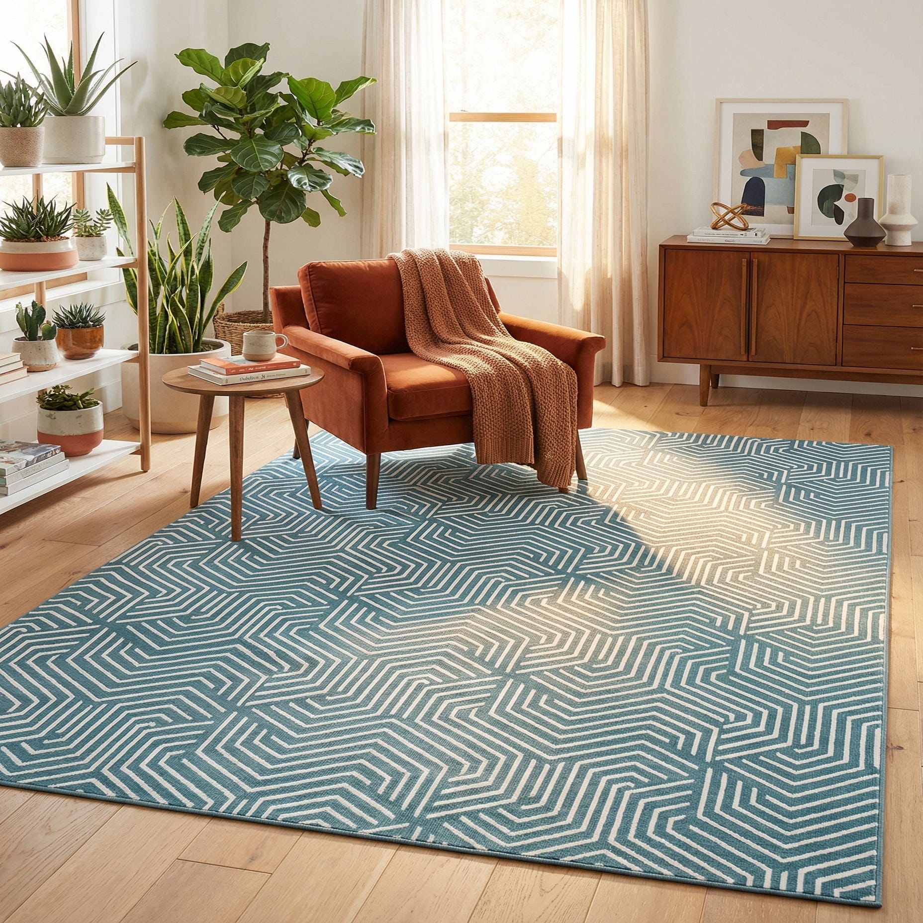 This rug works well as an anchor in a relaxed living room, under a bed to add visual interest to a bedroom, or beneath a dining table to introduce graphic pattern without heavy contrast. Pair it with light wood furniture, linen upholstery, and matte metal accents for a modern coastal or transitional look, or use it to bring a fresh geometric layer to mid-century and contemporary interiors.