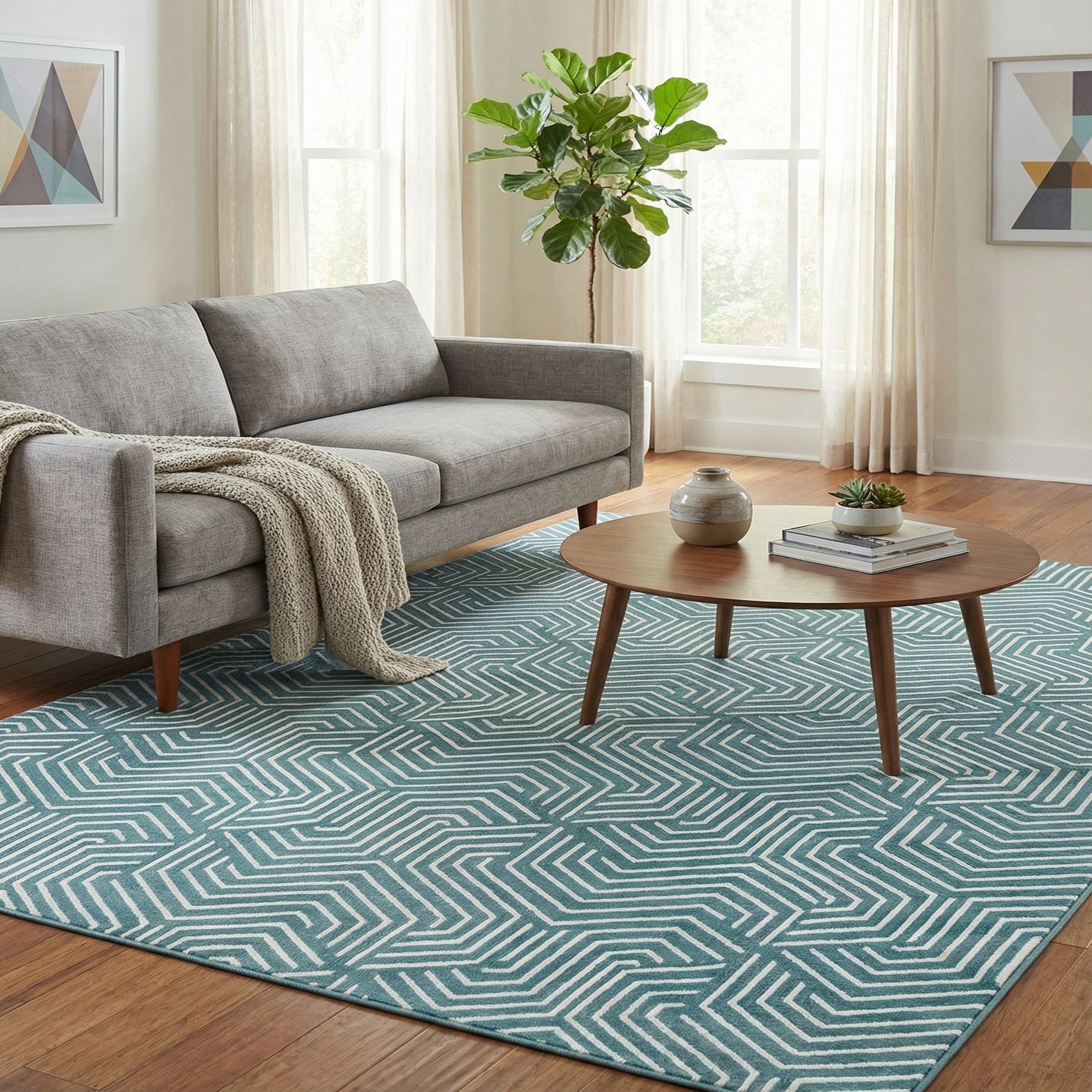 This rug works well as an anchor in a relaxed living room, under a bed to add visual interest to a bedroom, or beneath a dining table to introduce graphic pattern without heavy contrast. Pair it with light wood furniture, linen upholstery, and matte metal accents for a modern coastal or transitional look, or use it to bring a fresh geometric layer to mid-century and contemporary interiors.