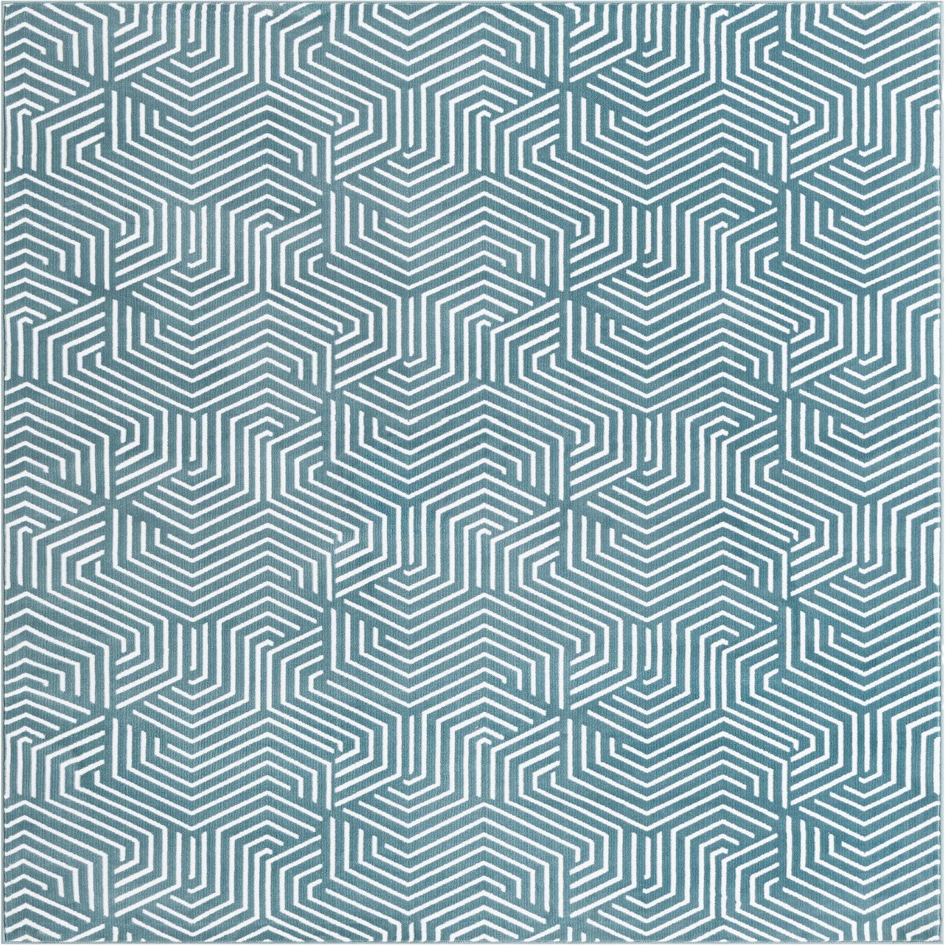 A geometric design of interlocking hexagonal chevrons in ivory sits crisply against an Aegean Blue ground, creating a rhythmic, contemporary pattern that draws the eye without overwhelming the room. The machine-made construction blends 85% polypropylene with 15% chenille, giving the surface a smooth, stable base with slightly raised chenille lines you can feel underfoot—soft and textured where the ivory motif is, with a firmer Aegean Blue field beneath.