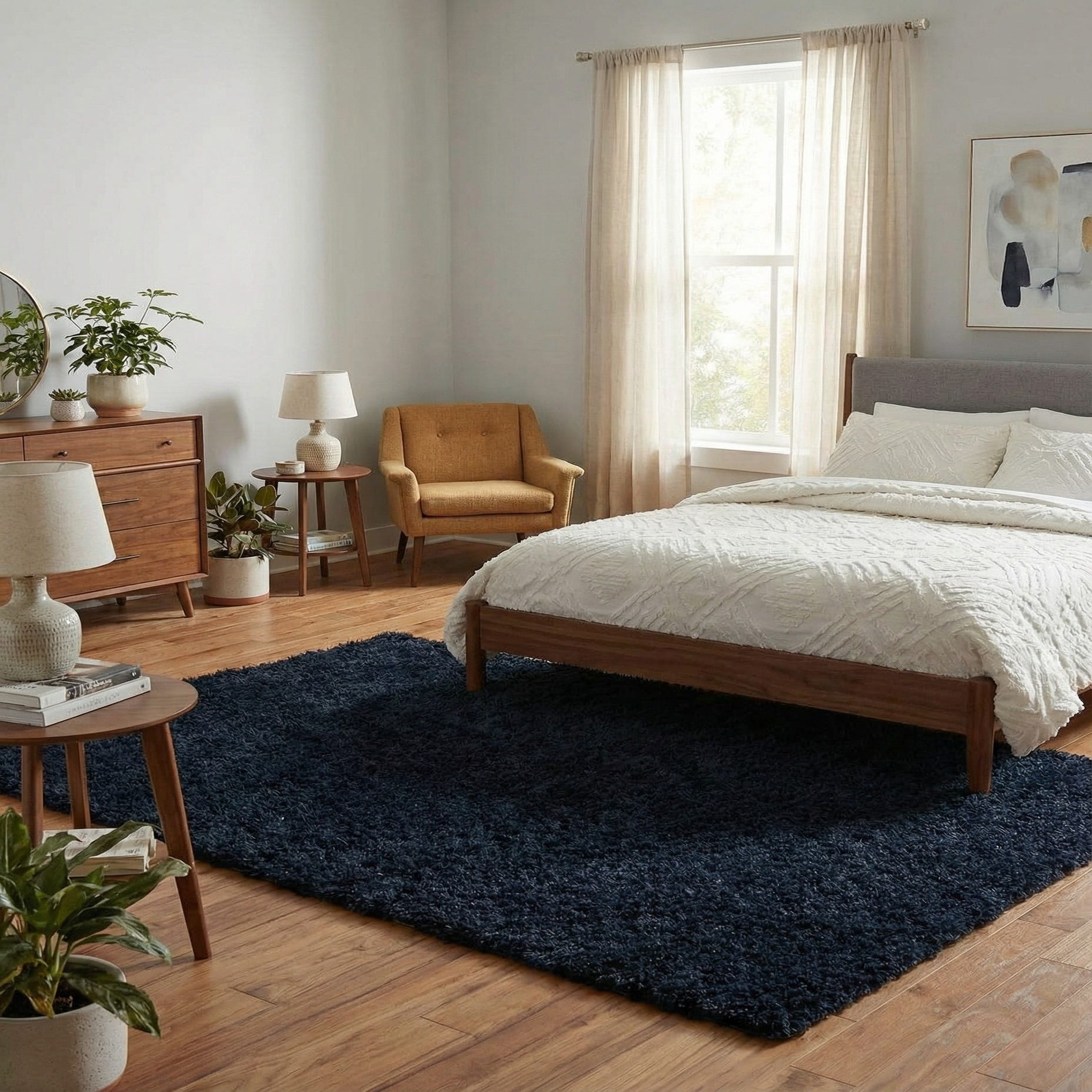 Place this rug under a low-profile sofa and a glass or metal coffee table for a modern living room that balances sleek lines with softness, or layer it in a bedroom to soften hardwood floors and complement light linens and warm wood tones. It also performs well in media rooms or cozy reading corners where the deep blue anchors the space; pair with brass or nickel accents and woven textiles to create contrast and warmth.