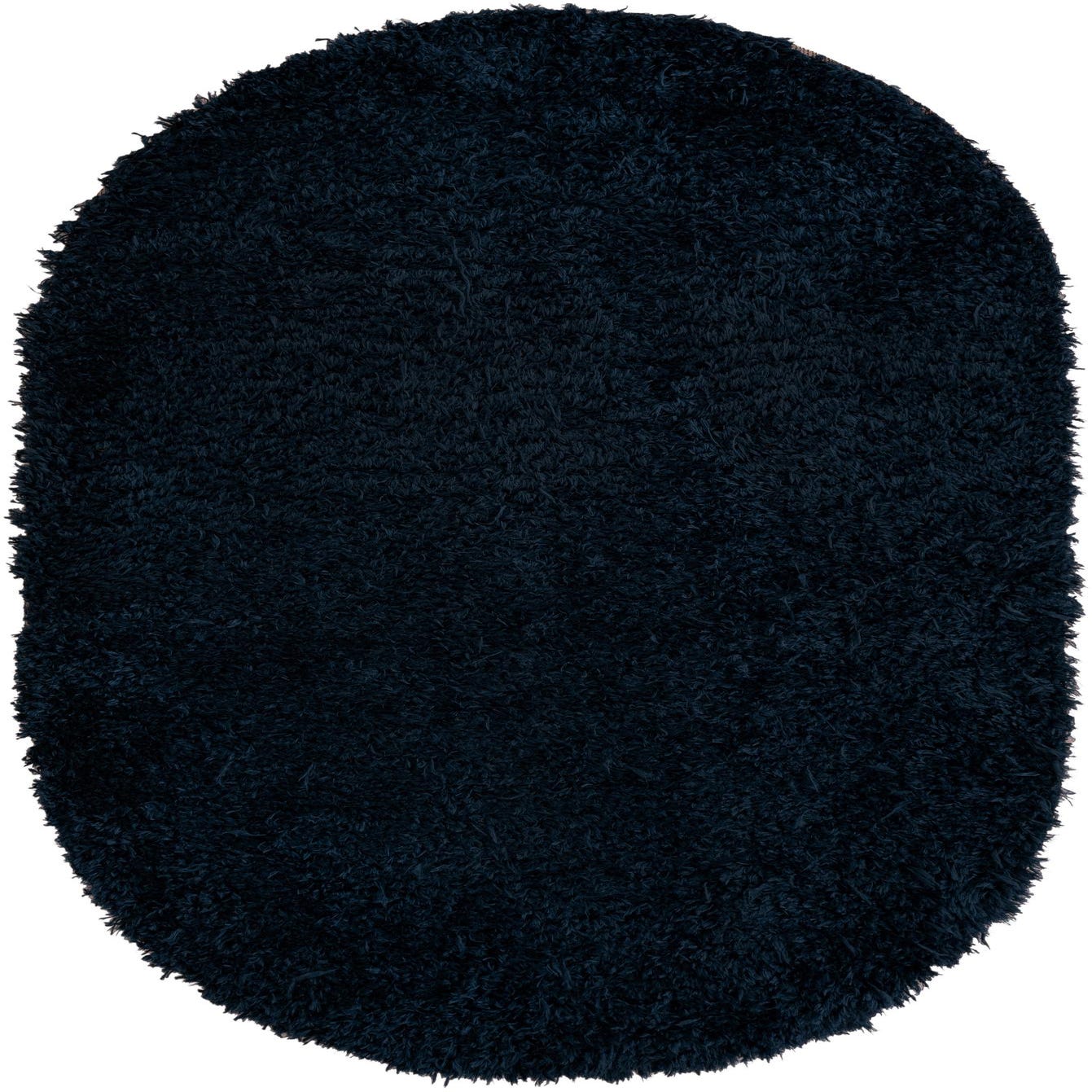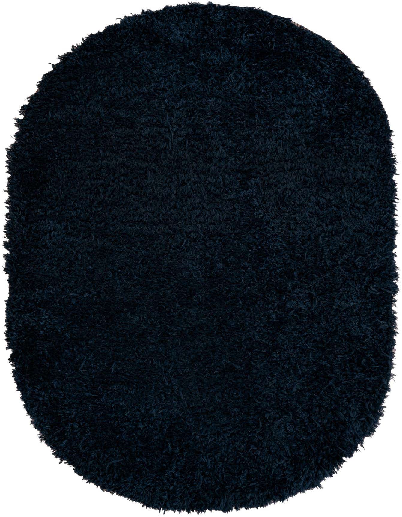 A plush, oval 5' 3 x 8' 0 navy blue shag rug, offering soft texture and modern comfort for an indoor space.