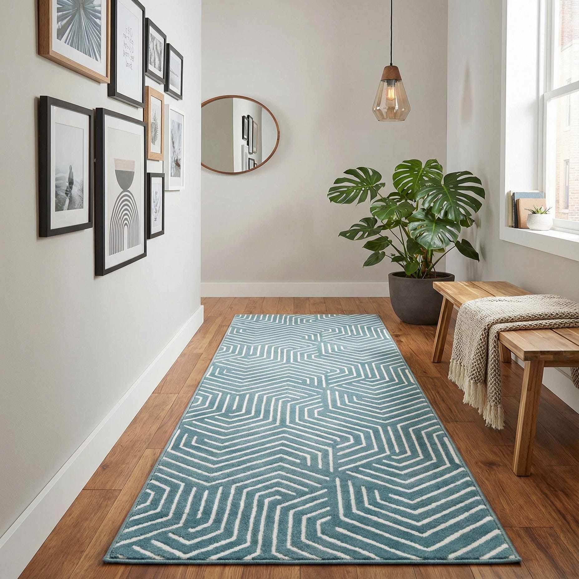 Aegean Blue provides a calming background for a crisp, linear ivory pattern that plays out in interlocking chevrons and angular pathways. The repeating geometric motif creates a sense of movement without overwhelming the space, and the contrast between the Aegean Blue field and the ivory lines keeps the design clean and modern. This runner has a contemporary sensibility with a nod to midcentury geometry, making it a versatile visual anchor in narrow spaces.