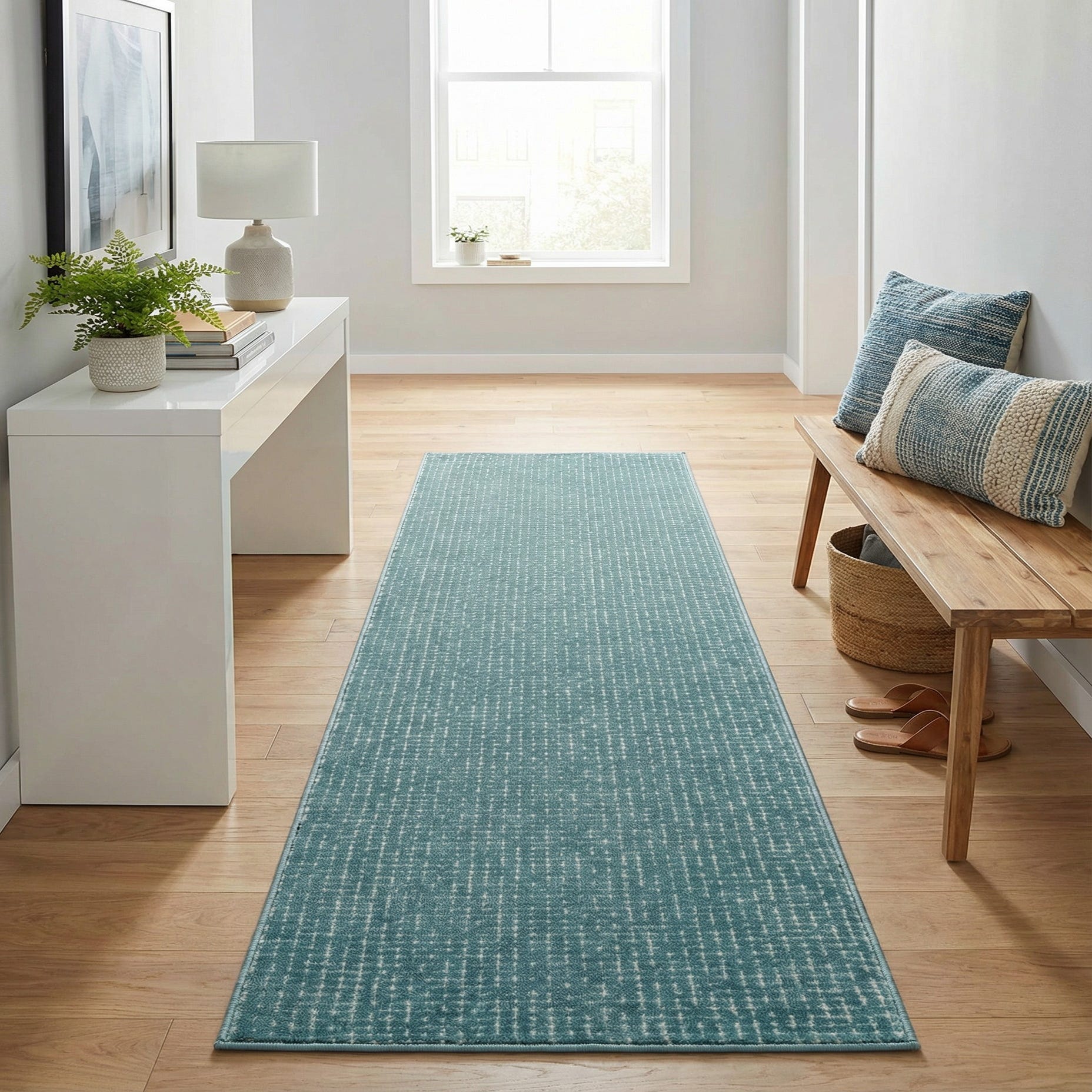 This runner works well in narrow or transitional spaces: place it in a hallway, entryway, or along a galley kitchen to add color without overwhelming the room. It pairs naturally with light wood floors, white or neutral cabinetry, and coastal or contemporary furnishings; contrast it with warm metallics like brass or matte black accents for a more tailored look. The balanced tone of Aegean Blue and ivory makes it easy to layer with textured throws, linen upholstery, or woven baskets for a lived-in, approachable aesthetic.