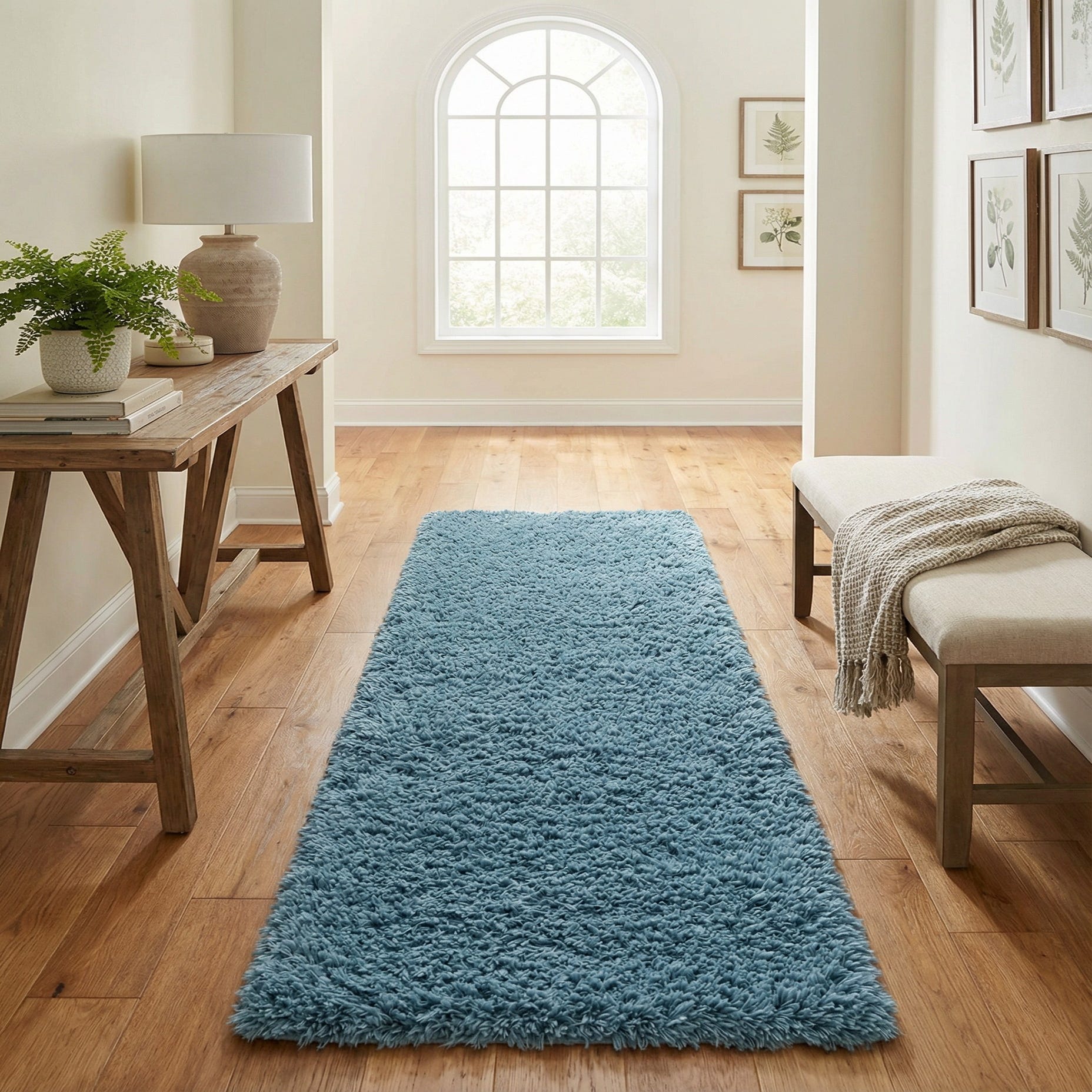 Solid Aegean Blue covers this long, narrow shag runner in a single, uninterrupted field that puts texture at the forefront. The high-pile, long-cut polyester fibers feel soft and springy beneath your feet, with a dense, tactile surface that cushions each step. Machine-made construction provides even pile height and clean edges, while the absence of a printed pattern keeps the look calm and modern—color and texture do the design work here.