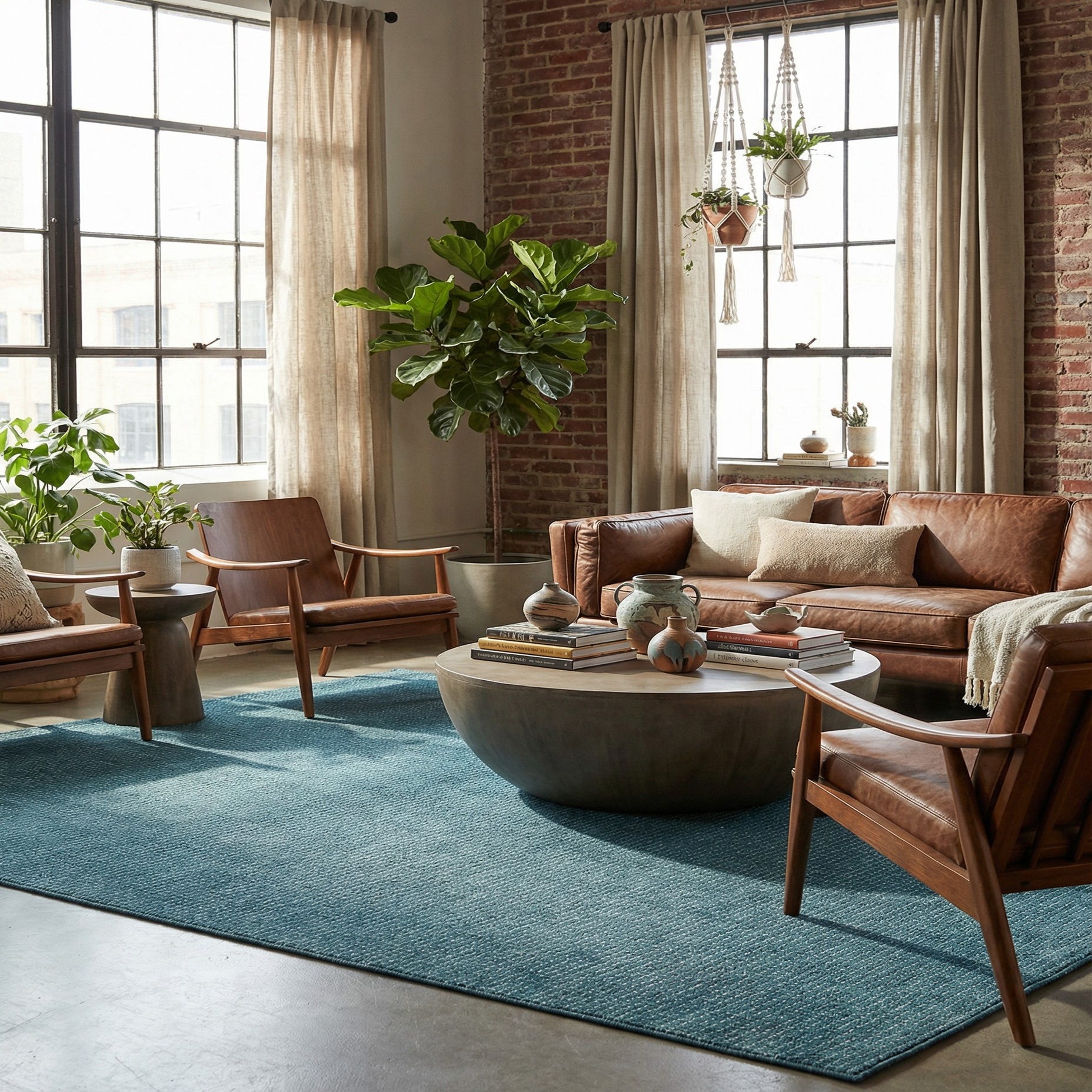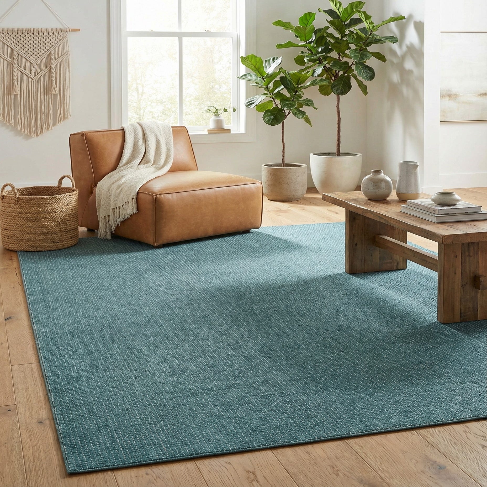 This piece works well in coastal, contemporary, or transitional interiors — use it to anchor a living room seating group, add a cool, relaxing layer under a bedroom set, or introduce color beneath a dining table without competing with patterned dinnerware. Pair it with light wood furniture and ivory textiles to highlight the rug’s contrast, or add matte black or brass accents and textured throws for a modern, balanced look.