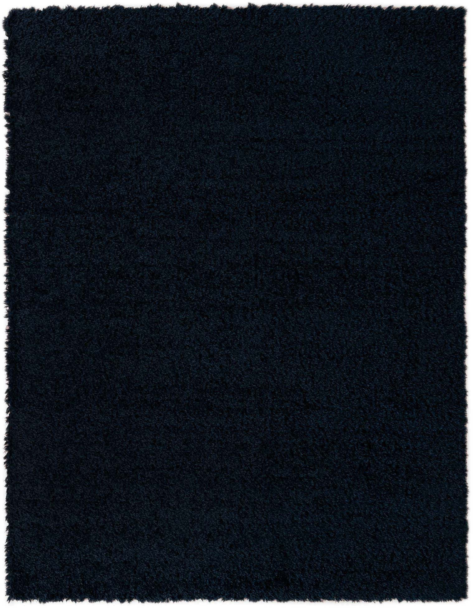 Aegean Blue covers this rug in a deep, even tone with a plush, high-pile shag that invites bare feet. The surface is uniform and pattern-free, offering a clean, modern look while subtle variations in the dense polyester fibers create visual depth and a velvety hand. Machine-made from 100% polyester, the construction gives the pile a full, cushiony feel without added ornamentation.
