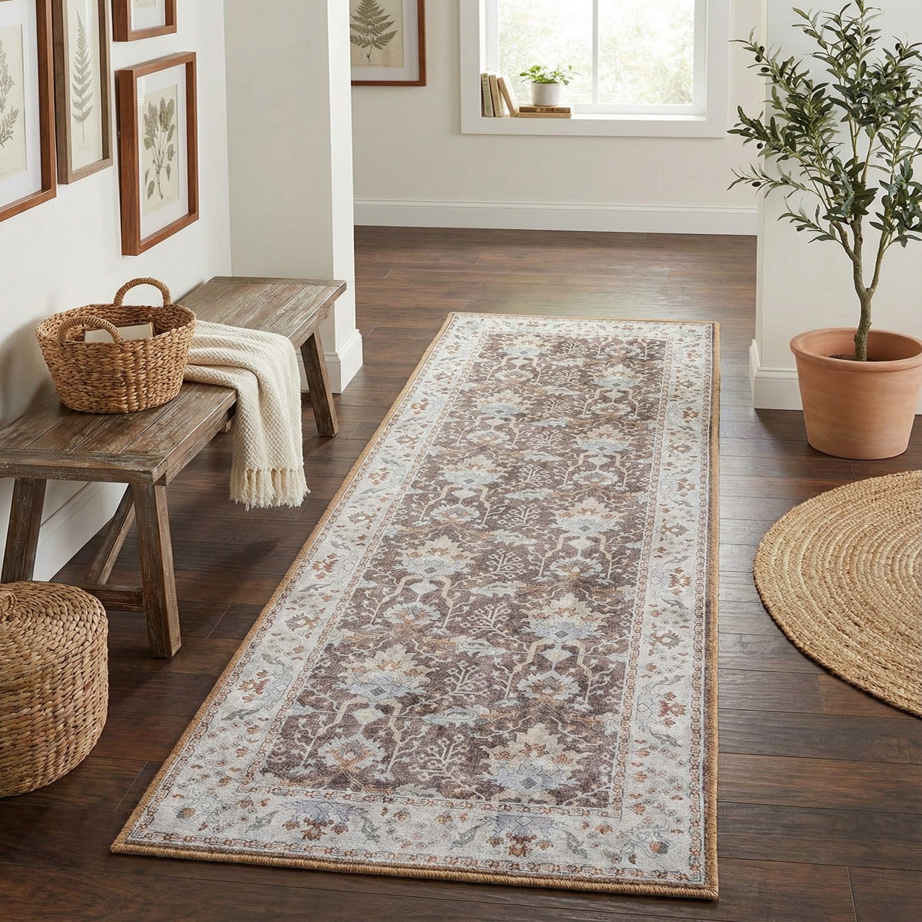 A 6 ft runner rug in almond brown with an oriental medallion pattern and a light border, ideal for hallways.