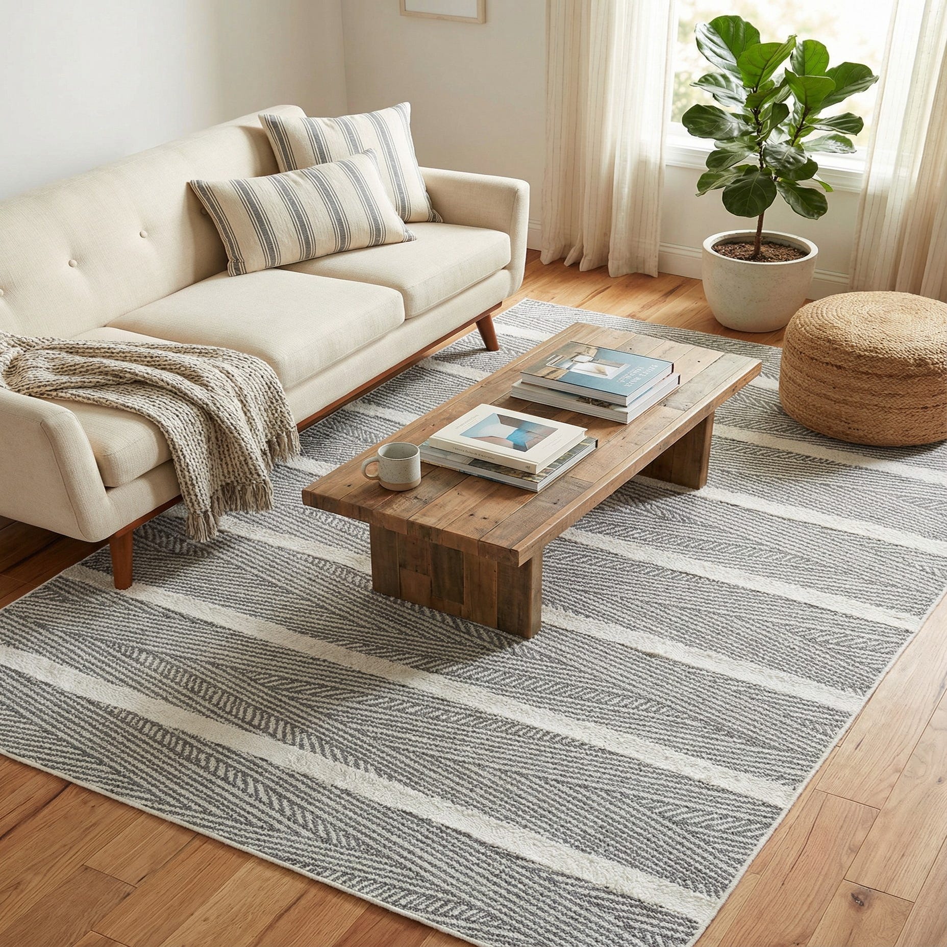 This piece suits contemporary and transitional interiors, grounding a neutral living room or adding quiet pattern to a bedroom without overpowering other elements. Pair it with light-wood furniture, black metal accents, or linen upholstery for a calm, layered palette. It also complements minimalist, Scandinavian, or modern farmhouse schemes where clean lines and textured surfaces are desired.