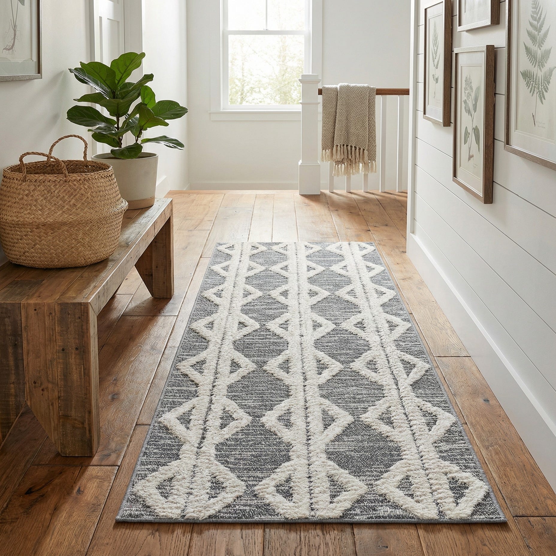 This runner works well in narrow circulation spaces—hallways, entryways, or alongside a bed—where the linear pattern can visually lengthen the area. It complements neutral, Scandinavian, modern farmhouse, or transitional interiors and pairs nicely with light wood floors, matte black or brushed metal accents, and crisp white or soft gray upholstery. Use it to add texture and geometric interest without overpowering existing decor.