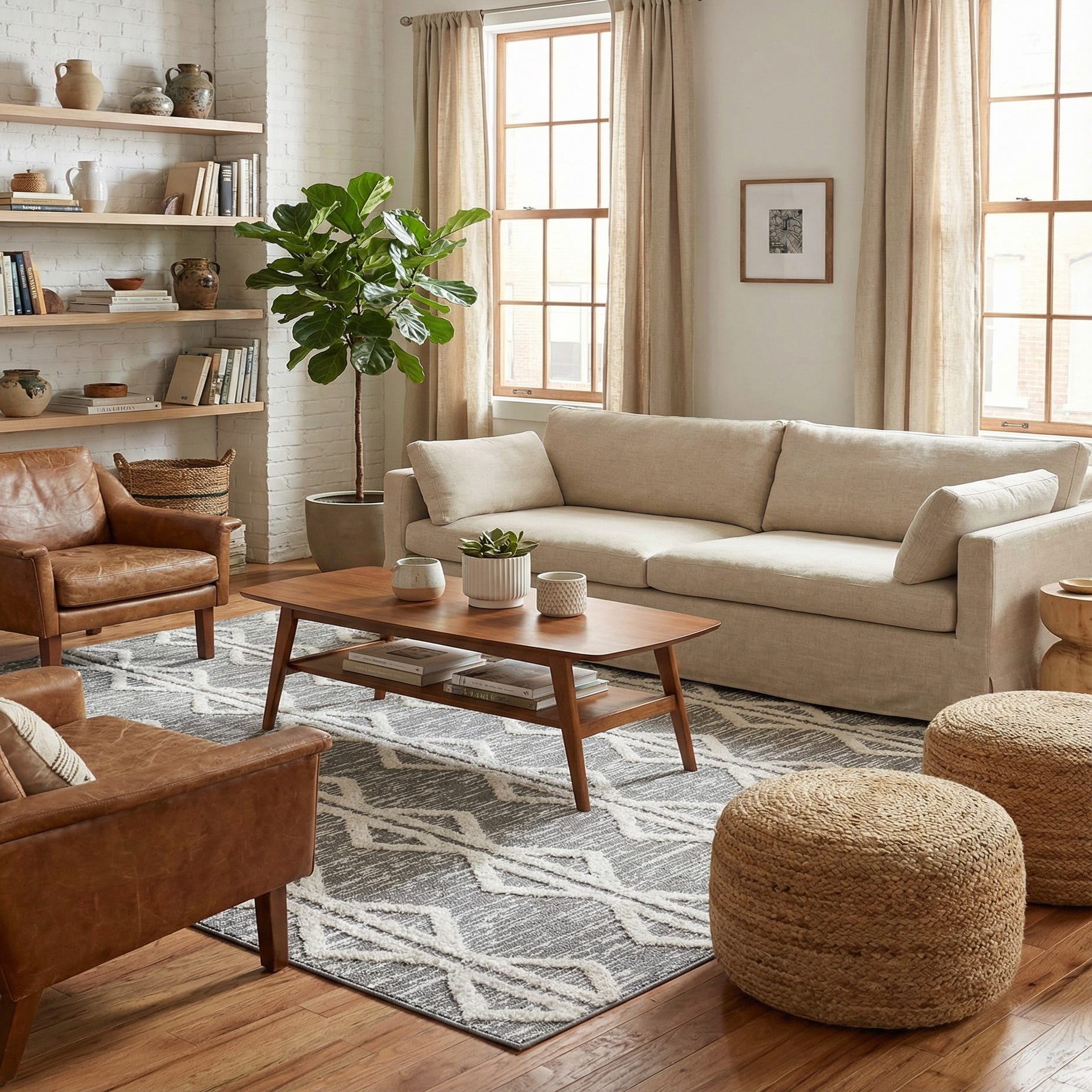 This rug pairs naturally with warm wood tones, cool metals and neutral upholstery, and works well in contemporary, Scandinavian, coastal or modern farmhouse interiors. Use it to anchor a living room seating area, layer it under a dining table for a more relaxed dining look, or place it beneath a bed to add texture and pattern to a neutral bedroom palette.