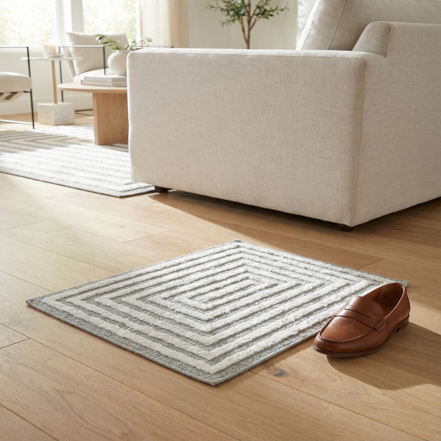 This sample suits a range of interiors — place it under a streamlined sofa to anchor a contemporary living room, layer it in a neutral bedroom to add subtle pattern and softness, or use it in an entryway to introduce graphic interest without bold color. The anthracite and ivory palette pairs well with warm wood tones, black metal accents, and pale linens for a calm, collected look. This piece is a sample.