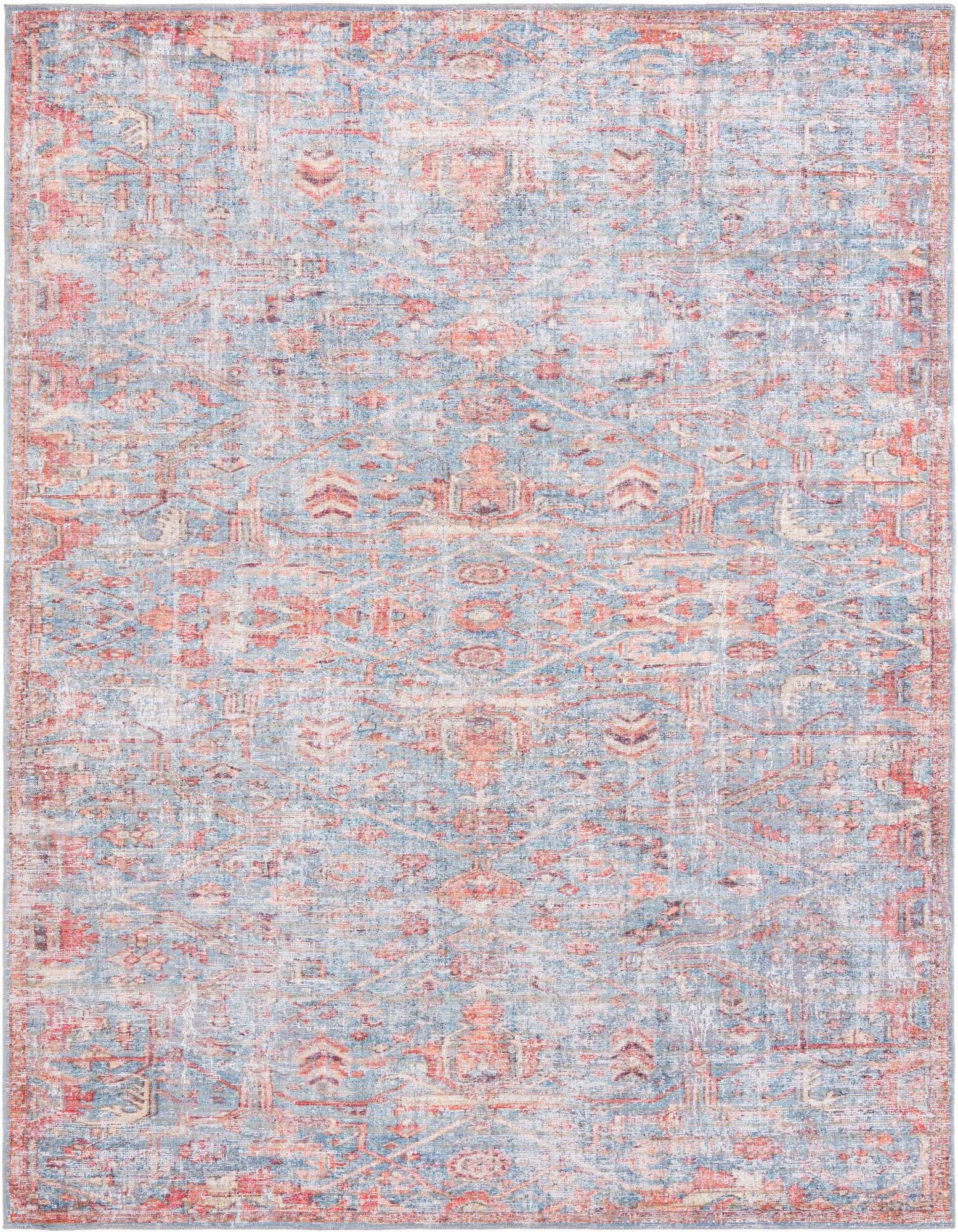 The Nostalgia Collection presents a 10x13 area rug, machine woven from polyester chenille for a compelling blend of durability and soft texture. The color palette encompasses an Antique Blue background, gracefully overlaid with tones of Ivory, Gray, Red, Rust Red, and hints of Pink, creating a rich visual narrative within the design. This rug's pattern bears a vintage-inspired character with subtle, intricate motifs that invite a closer look without overwhelming the space.