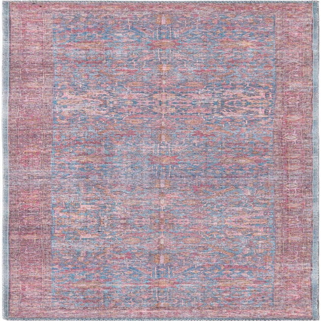 A 6 ft runner rug with a distressed traditional tribal pattern in shades of blue, pink, and orange, ideal for a hallway.