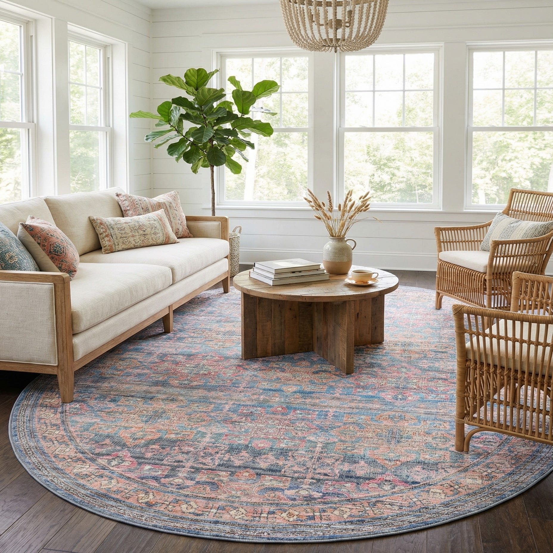 Machine-made of polyester chenille, the surface has a soft, velvety hand and a low, dense pile that yields slightly underfoot. The chenille fibers carry color with a subtle sheen, highlighting the finer details of the pattern while keeping the texture plush but not lofty. This rug pairs naturally with light-wood furniture and linen upholstery in coastal or cottage schemes, complements a transitional living room with gray or ivory sofas, and can add a relaxed, layered look to a bedroom—particularly when placed under the foot of the bed or centered in a seating nook.