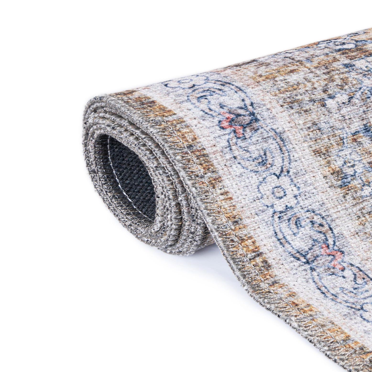 A vintage-inspired floral field and ornate border sit on an antique gold ground, creating a softly weathered Persian look. Ivory and gray blooms and scrolling vines form the main motif, while light blue and navy accents bring cool highlights and small touches of red and black add low-contrast definition. Machine-made from polyester and chenille, the surface has a velvety hand from the chenille with a subtle sheen, while the polyester gives the piece a low-profile structure you can feel underfoot.