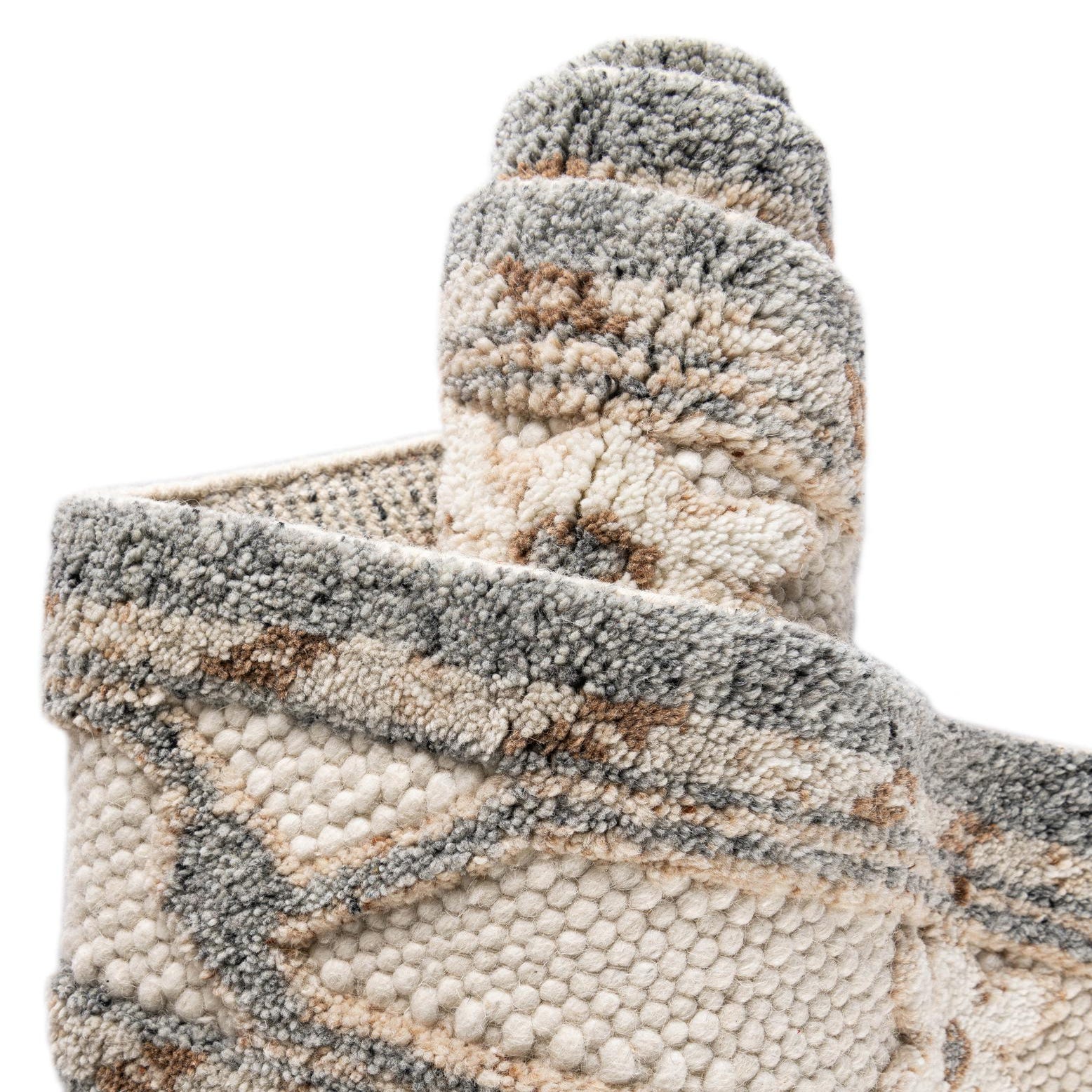 A 12 ft runner rug with an antique gray, beige, and cream modern abstract pattern, perfect for a hallway.