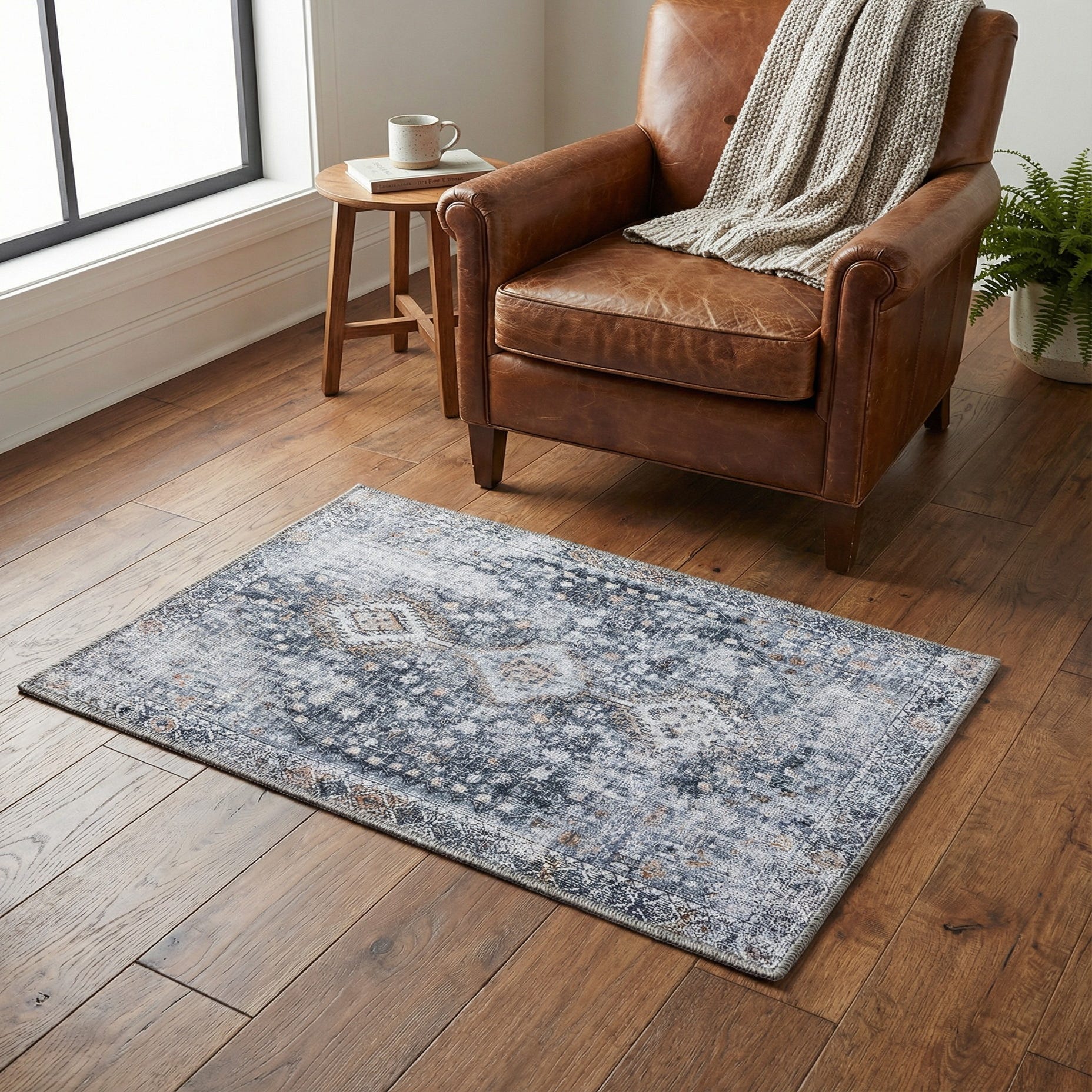 This rug works well in compact or transitional settings — place it in an entryway, in front of a sink, layered over hardwood, or at the foot of a bed to add visual interest without overwhelming the room. It pairs naturally with warm woods, leather seating, matte black metal accents, and neutral upholstery; use it to anchor a cozy reading nook or to soften an industrial or modern farmhouse scheme. The antique gray background keeps the palette calm while the beige and brown highlights bring a touch of warmth to the space.