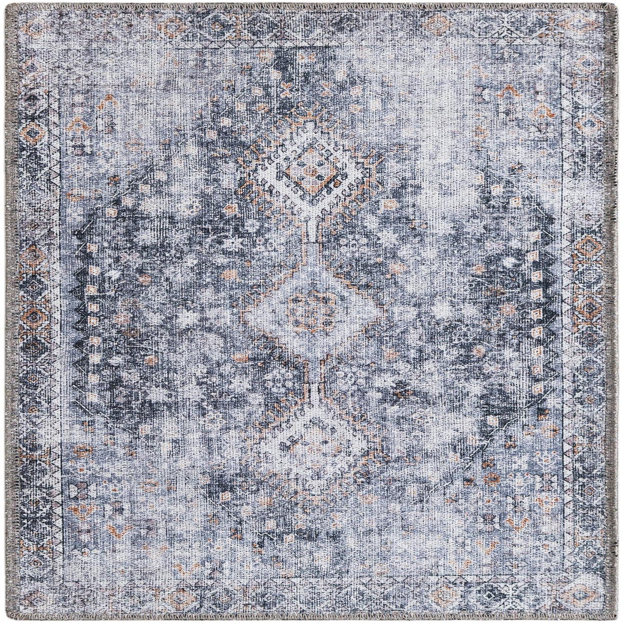 This rug works well in compact or transitional settings — place it in an entryway, in front of a sink, layered over hardwood, or at the foot of a bed to add visual interest without overwhelming the room. It pairs naturally with warm woods, leather seating, matte black metal accents, and neutral upholstery; use it to anchor a cozy reading nook or to soften an industrial or modern farmhouse scheme. The antique gray background keeps the palette calm while the beige and brown highlights bring a touch of warmth to the space.