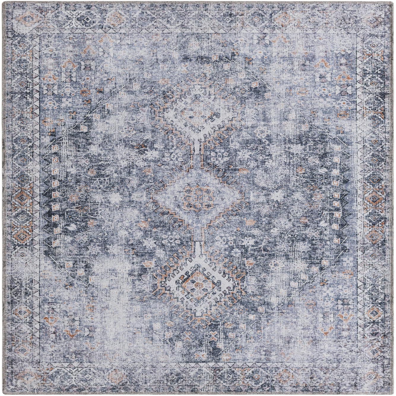 A 4x6 rectangular Rugs.com Yara rug in antique gray with a distressed, ornate pattern and subtle orange accents.