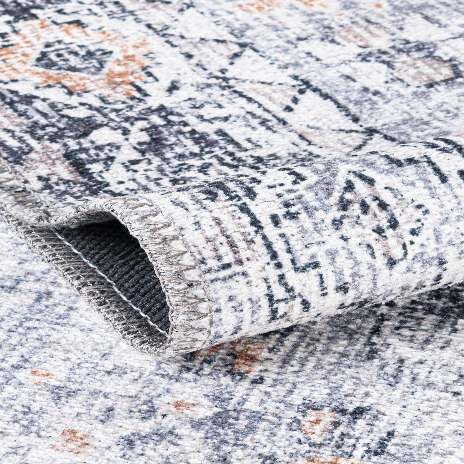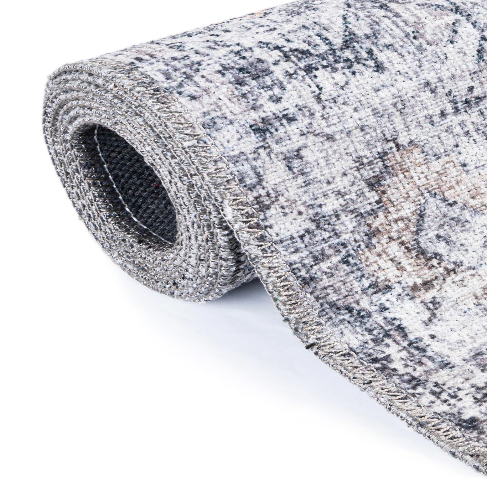A low-contrast medallion motif rests on an antique gray ground, with distressed ivory and beige details threaded through darker black and brown accents to create a gently aged, vintage-inspired look. The traditional geometric center medallion and narrow border are softened by a worn finish that keeps the pattern subtle and layered rather than literal. Machine-made from polyester and chenille, the surface has a soft, velvety hand with slight chenille pile highlights that lend tactile depth and a soft sheen underfoot.