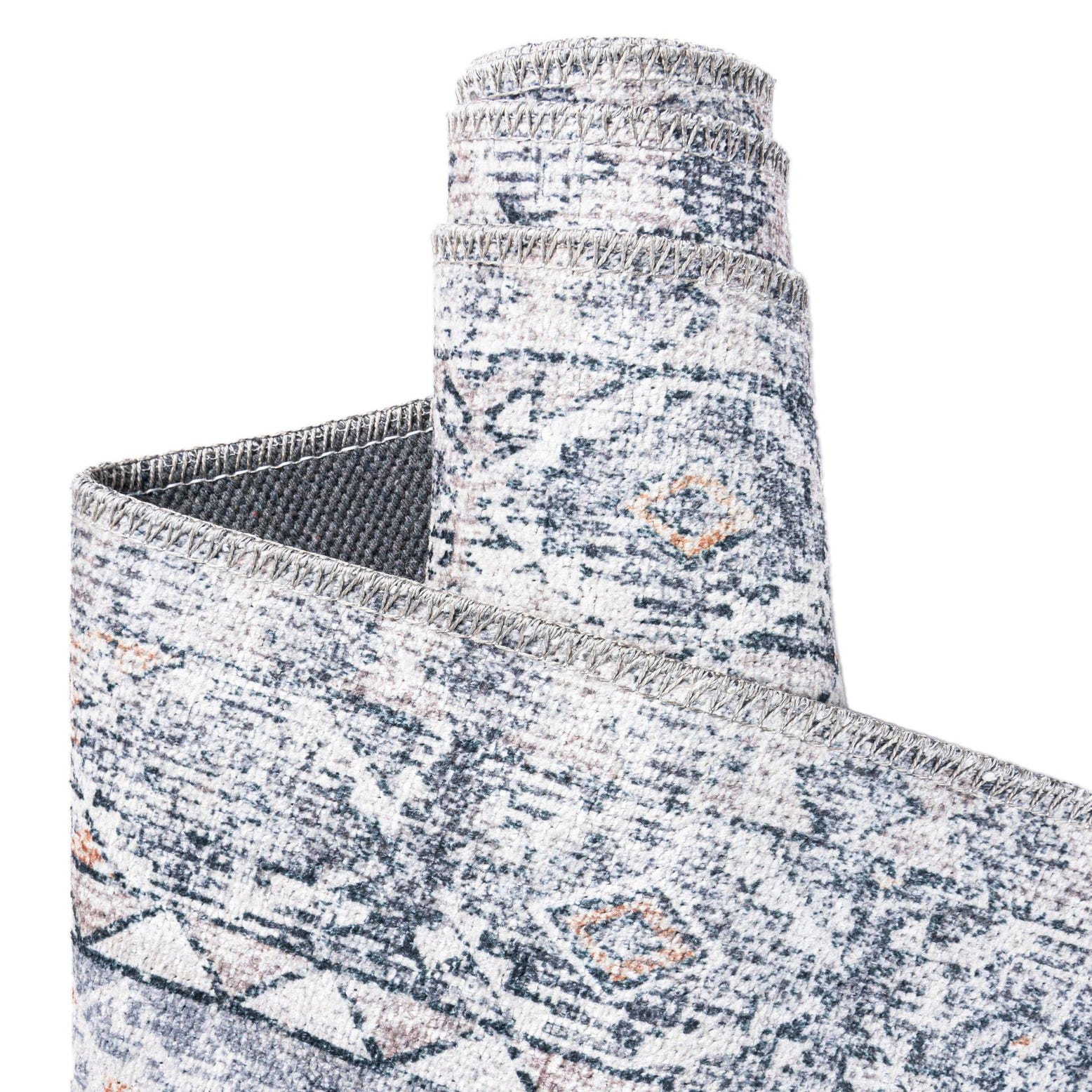 Place this rug to anchor a relaxed living room seating area beneath a coffee table or to add quiet pattern at the foot of a bed. It pairs beautifully with light oak or walnut furniture and neutral linen upholstery, while matte black or oil-rubbed metal accents will pick up the rug’s darker tones. The muted palette and transitional pattern work well in contemporary traditional, modern farmhouse, or coastal-inspired interiors where a calm, layered foundation is desired.