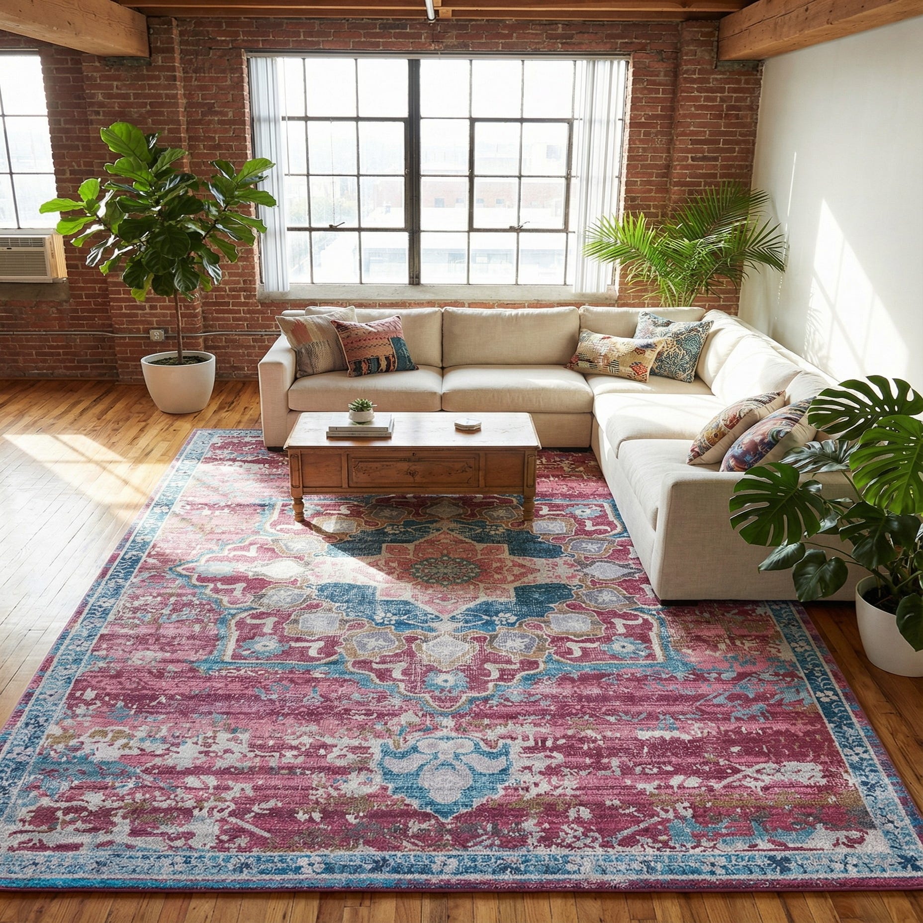 A central medallion and ornate floral motifs sit atop an antique pink background, creating a refreshed take on traditional area rug design. The pattern mixes saturated burgundy and deeper pink fields with sky and light blue accents, while ivory, gray and peach highlights trace the medallion and border details. A deliberately distressed finish gives the surface visual texture and depth, where color appears layered and gently worn across the field.