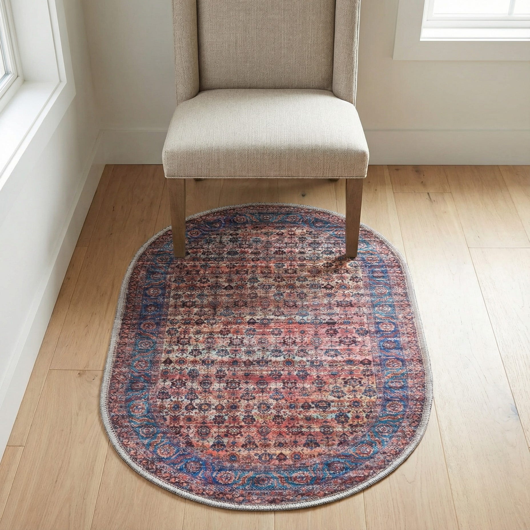 Machine-made from polyester chenille, the surface has a soft, velvety hand and a low-to-medium profile that feels pleasant underfoot without adding bulk. Place it in an entry or foyer to introduce color, alongside a bedside for a warm, tactile landing when you step out of bed, or under a small seating arrangement or reading nook to anchor the space. The color mix and vintage sensibility work especially well with eclectic and bohemian interiors, modern-traditional living rooms, or feminine shabby-chic and cottage-style schemes.