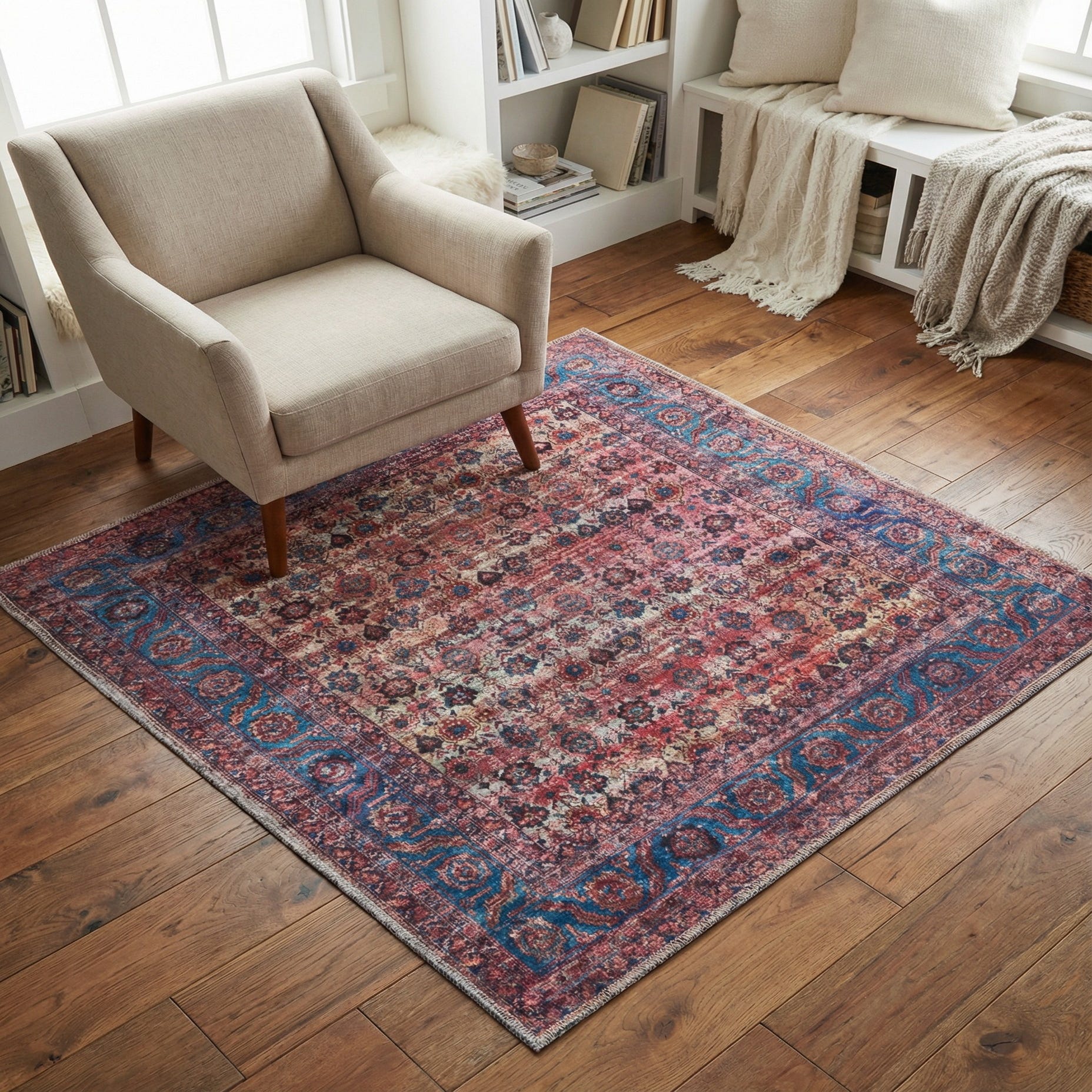 This rug brings color and pattern to compact areas—place it to anchor a small seating group, tuck it under a bedside to warm a bedroom, or use it in an entry or reading nook for an instant decorative lift. It pairs well with warm wood tones and neutral upholstery, complements mid-century and transitional furnishings, and fits naturally into eclectic or bohemian schemes where layered textiles and mixed color play are welcomed.