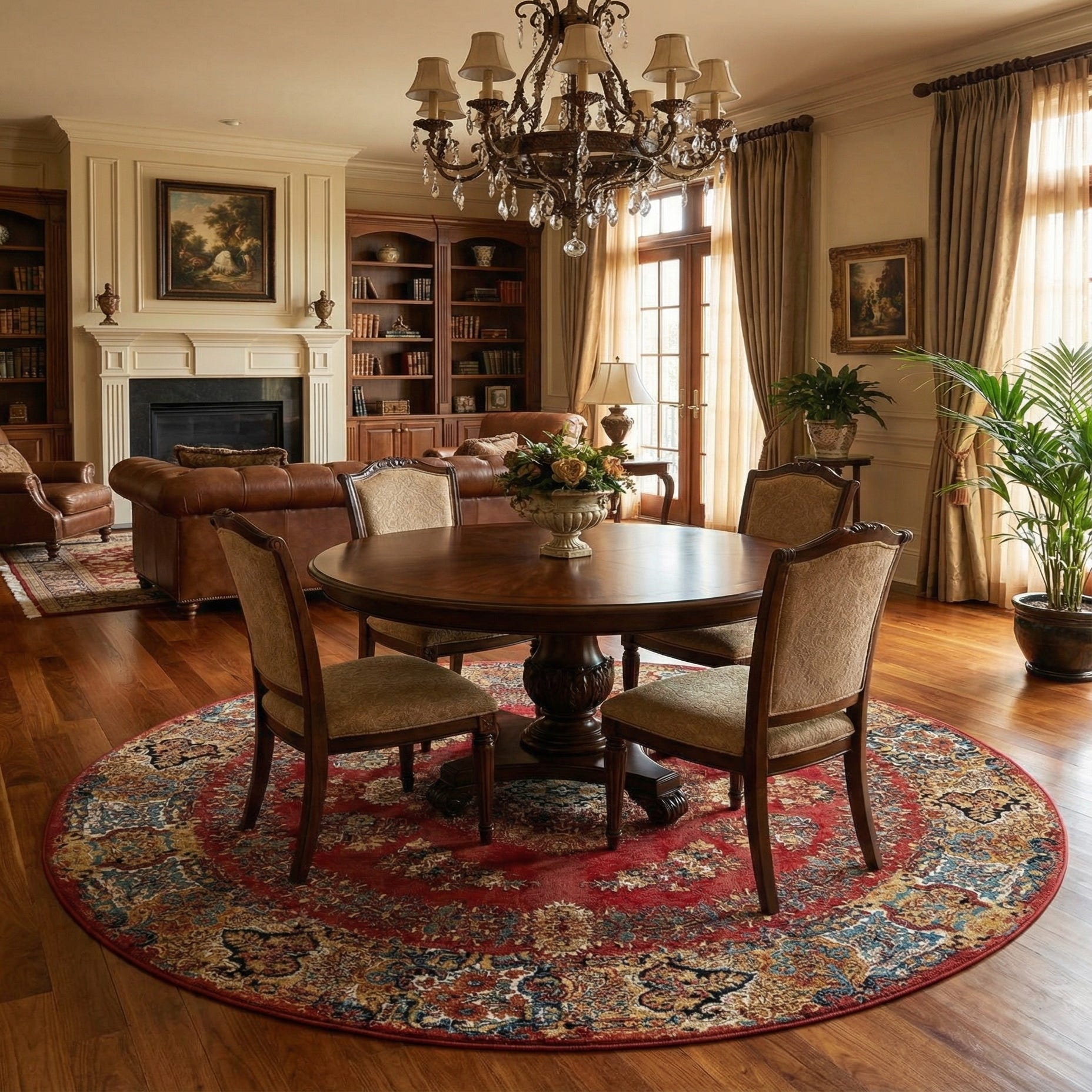 This round piece works well wherever a circular anchor is needed: centered beneath a round dining table, defining a conversation area in a covered patio or sunroom, or grounding an entryway vignette. It pairs naturally with warm woods, leather seating, rattan or iron furniture and layered textiles, and it complements traditional, transitional or global-inspired décor schemes.