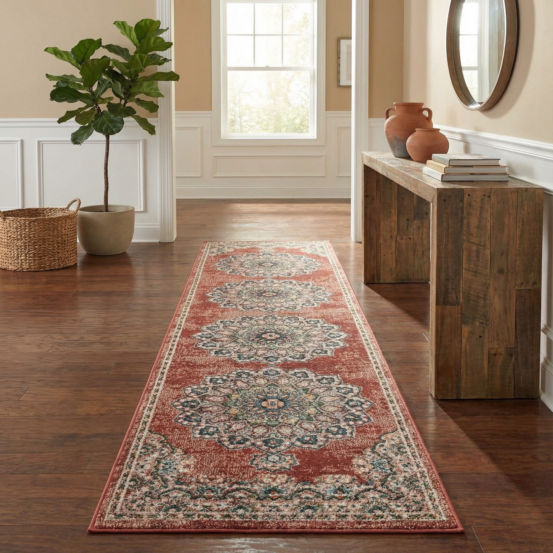 Primary color is Antique Red. Colors in this rug include: Antique Red, Beige, Black, Blue, Ivory, Light Blue, Orange, Green, Red.