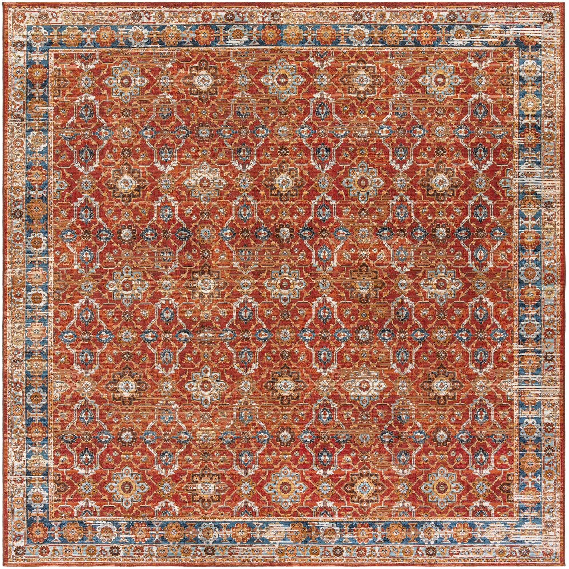 A 10'x10' square red traditional indoor/outdoor rug with an intricate oriental pattern and a distressed blue border.