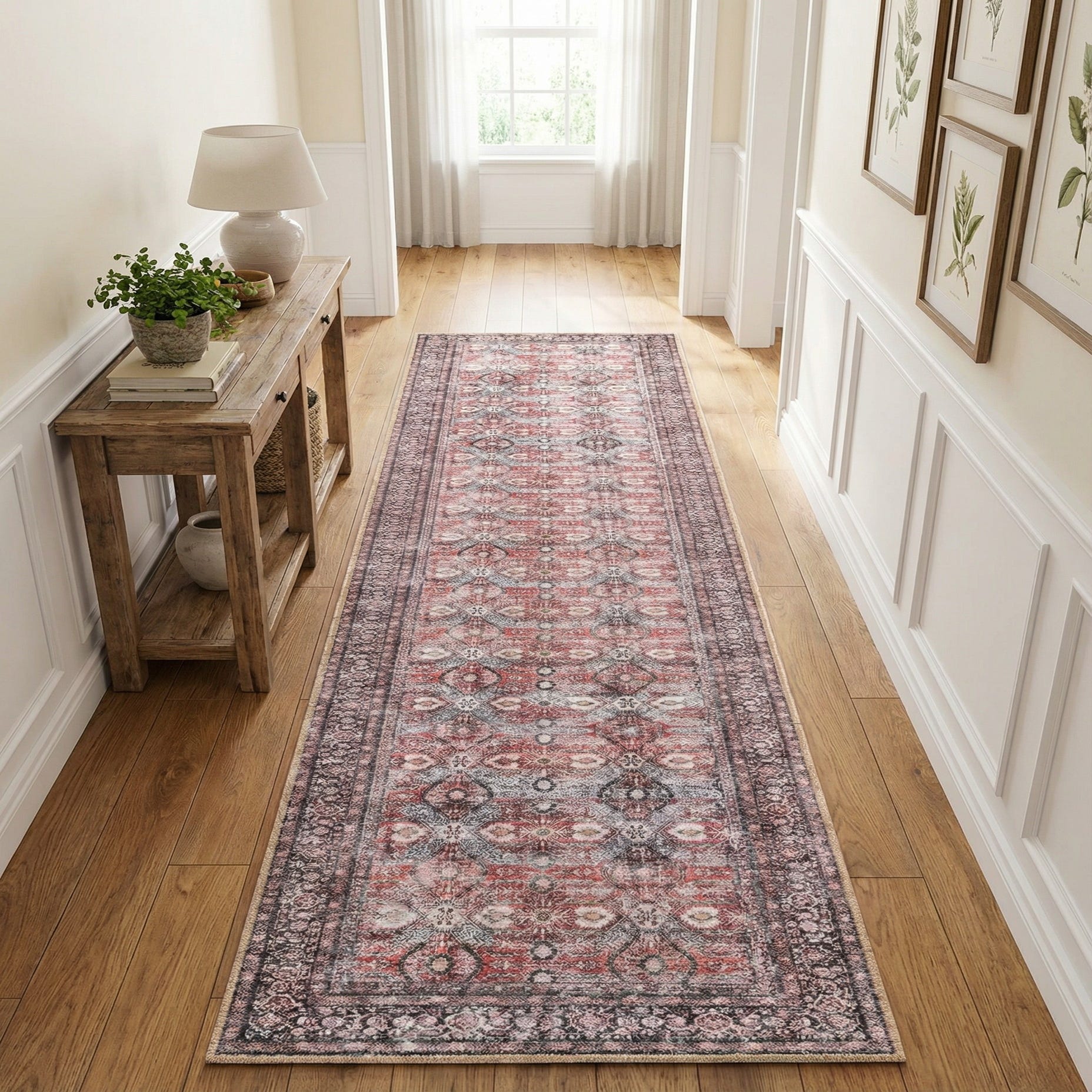 Constructed of 100% polyester, the pile is low-profile and soft to the touch with a subtle, smooth hand that lays flat underfoot. As a runner, it works well in long, narrow spaces such as hallways, entries, stair landings or alongside a kitchen island to add pattern and warmth without bulk. Pair it with warm wood floors and neutral upholstery for a timeless look, contrast it with painted cabinetry in cream or navy for a transitional kitchen, or use it to anchor seating in a traditional or eclectic entryway.