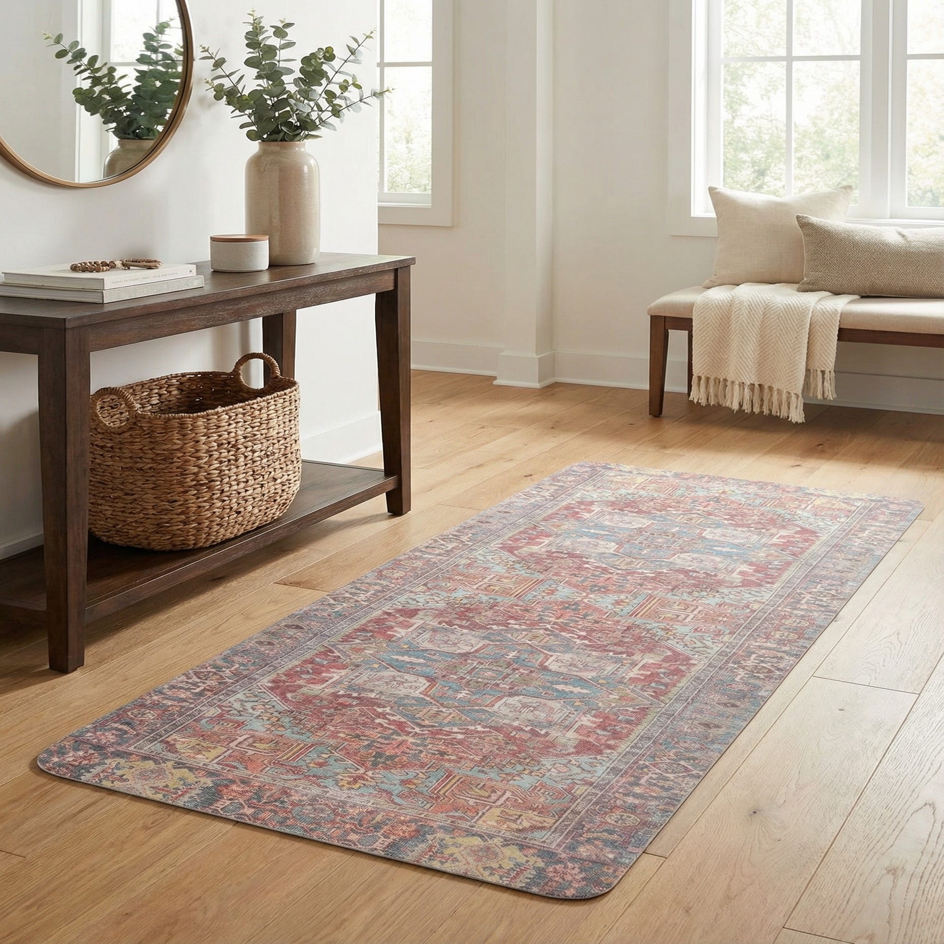 Primary color is Antique Red. Colors in this rug include: Antique Red, Brown, Rust Red, Green, Blue, Beige, Yellow, Black.