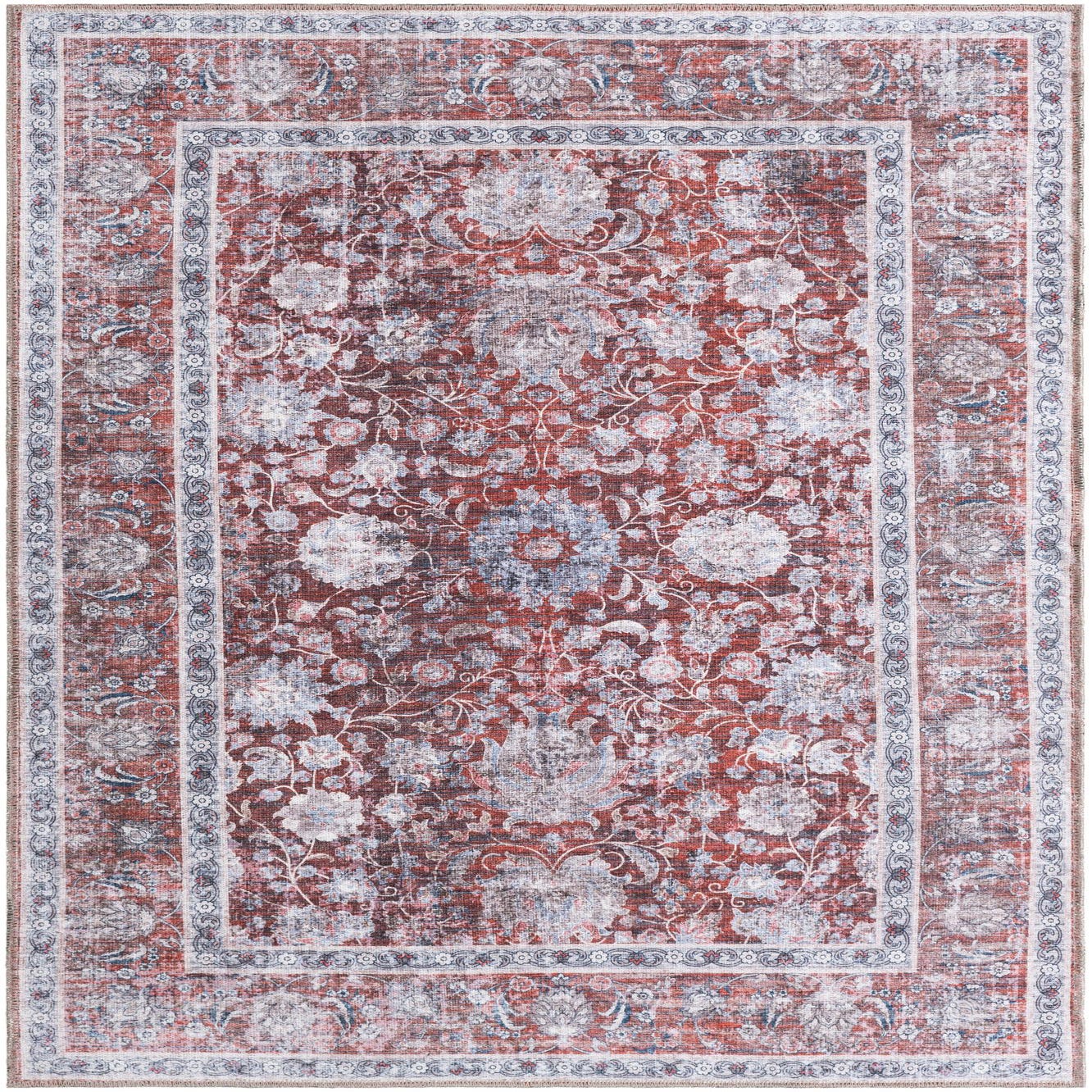 An antique red field sets a warm stage for an ornate, distressed floral pattern that balances traditional and casual sensibilities. A central medallion and scrolling vines unfold across the surface in layered tones of ivory, gray and blue, while beige, brown and black accents add depth and definition. A double border of small floral motifs frames the composition, giving the rug a lived-in, heritage look with subtle contrast between the lighter borders and richer center.