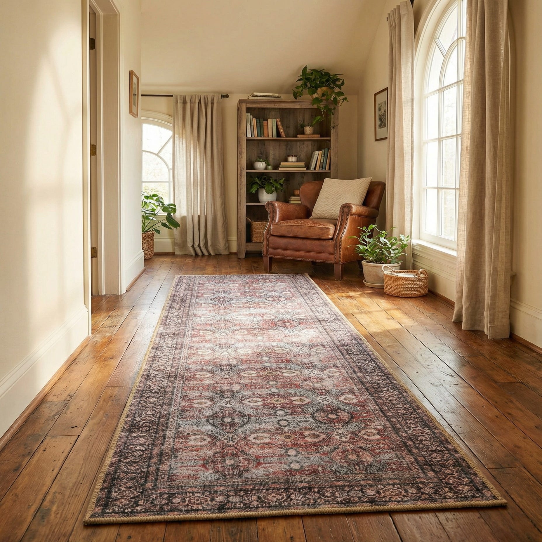 Made from 100% polyester, the rug has a soft hand with a low-profile pile that lies close to the floor, offering comfortable texture underfoot and easy layering in a room. Place it in a hall or entry to introduce color and pattern at eye level, run it through a narrow galley kitchen or between a sofa and console to anchor furniture, or use it at the foot of a bed to warm a bedroom floor. It pairs nicely with warm wood furnishings, neutral upholstery, and mixed-metal accents for a balanced, transitional aesthetic.