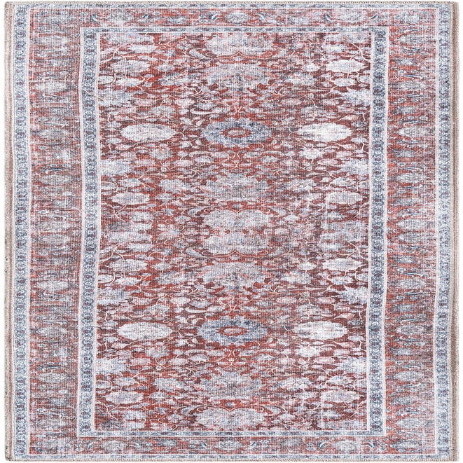 A 6 ft runner rug featuring a distressed traditional floral pattern in shades of red, white, and blue, ideal for a hallway.