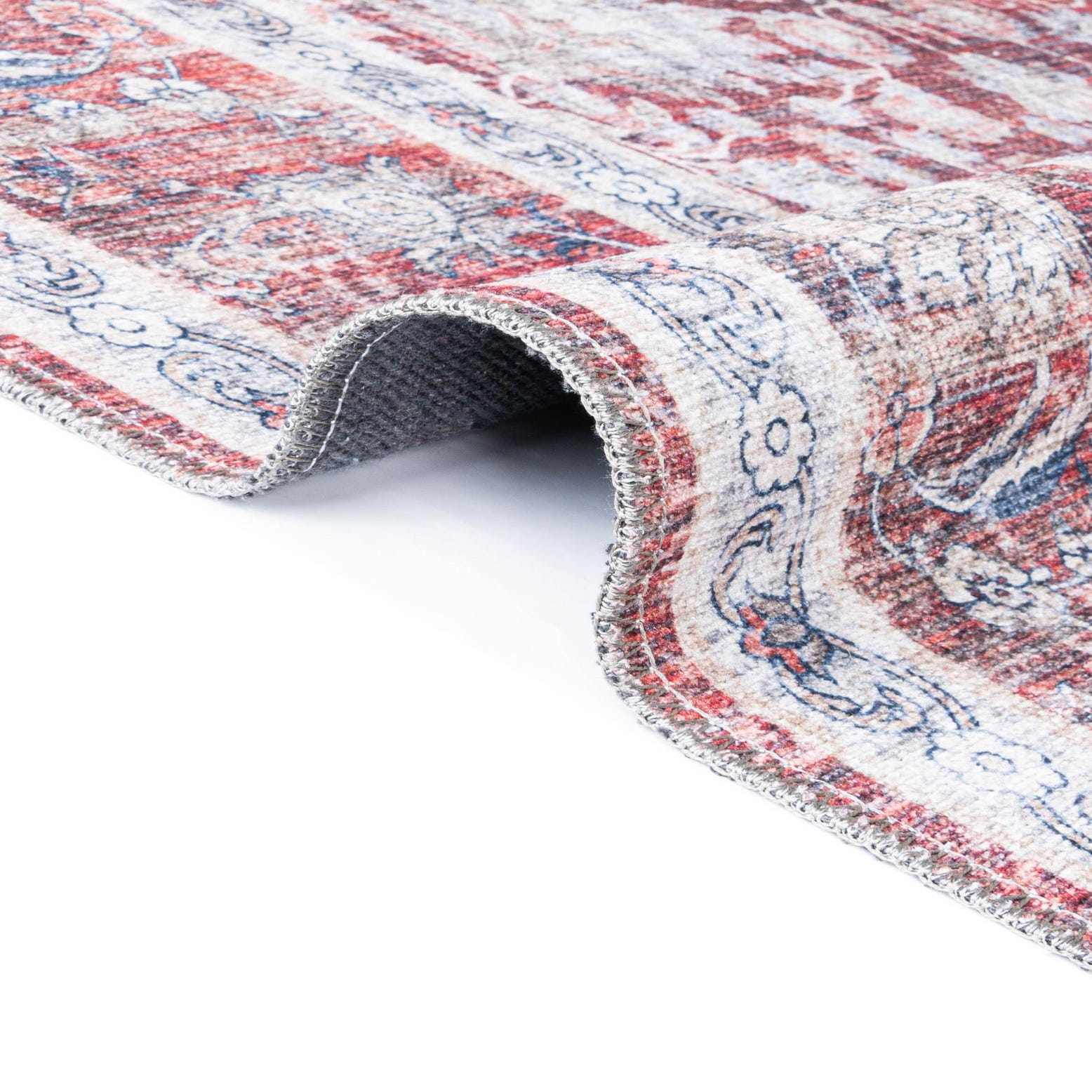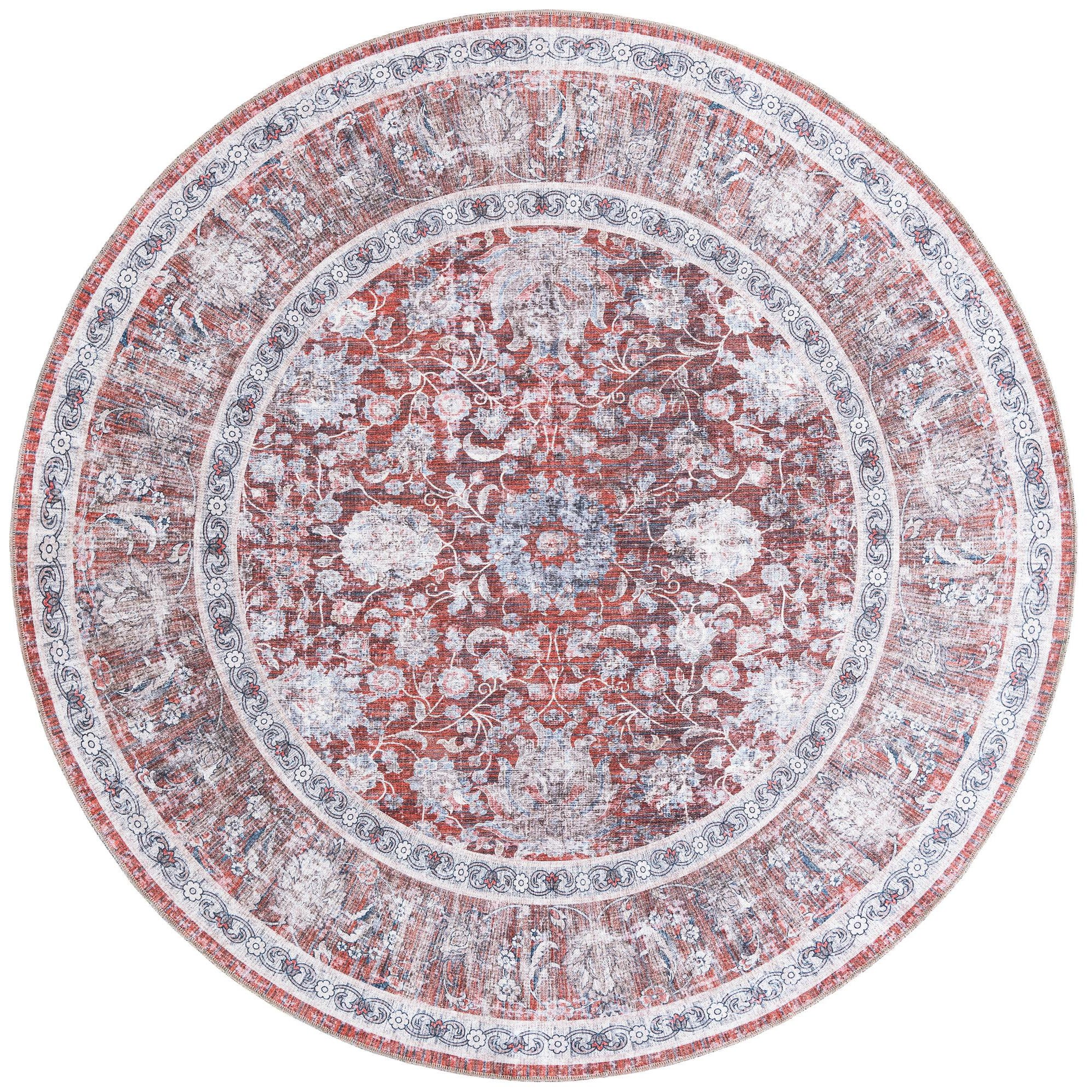 Antique Red provides a warm foundation for this round rug, where a traditional central medallion and scrolling floral vines unfold across the surface. Muted blue and ivory highlights define the medallion and larger floral motifs, while beige, gray, brown and touches of black trace the finer details and border. A softly distressed finish gives the pattern a lived-in, layered look—lighter washes of color across the field and outer band create visual texture and depth without heavy contrast.