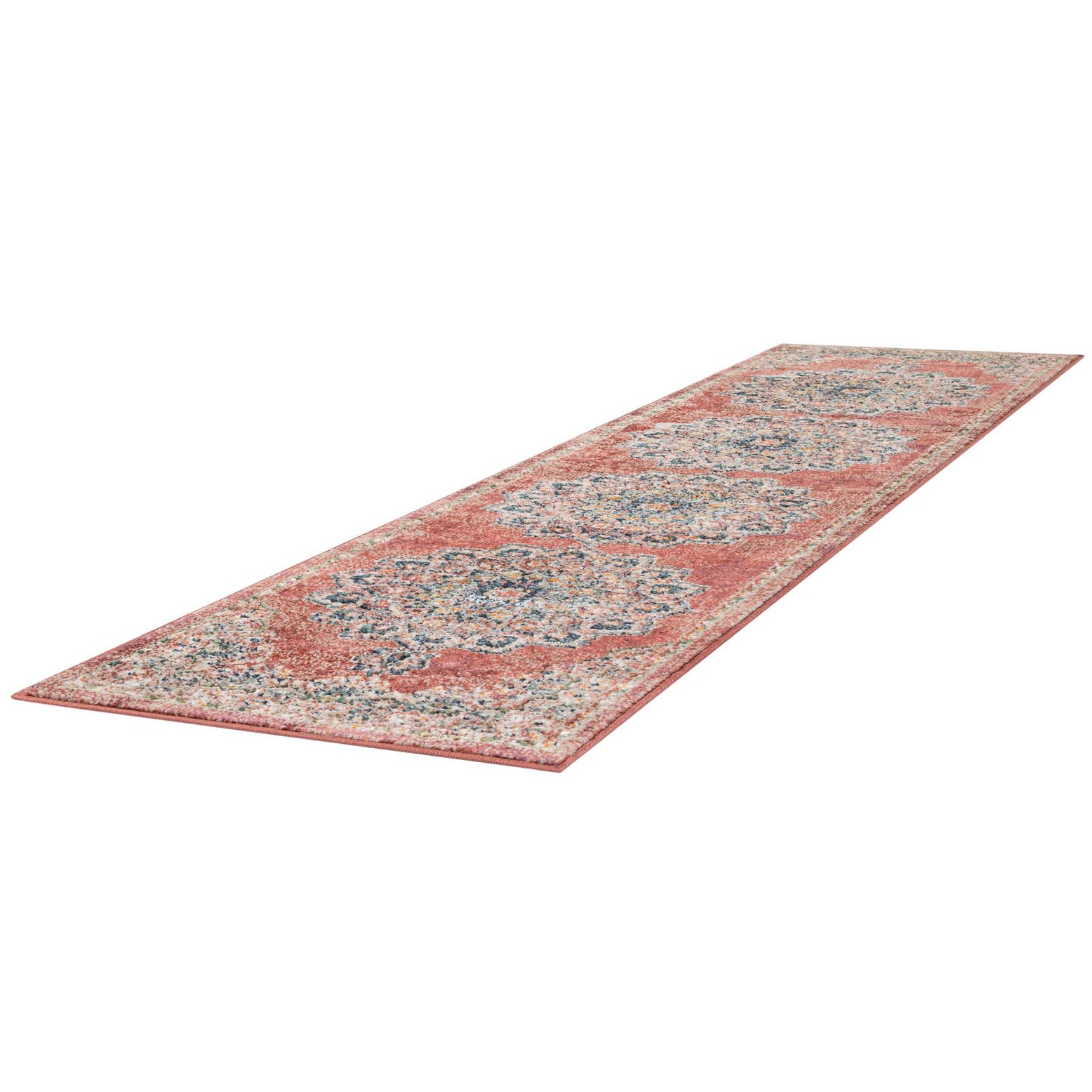 A long 8 ft runner rug in shades of red with intricate medallion patterns in blue, cream, and orange, suitable for a hallway.