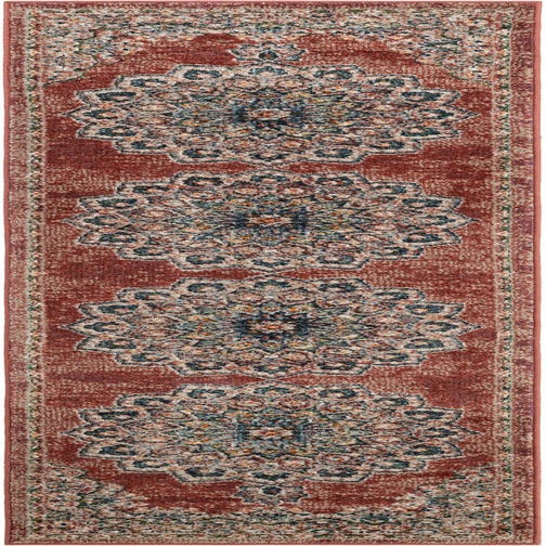 A long 8 ft runner rug in shades of red with intricate medallion patterns in blue, cream, and orange, suitable for a hallway.