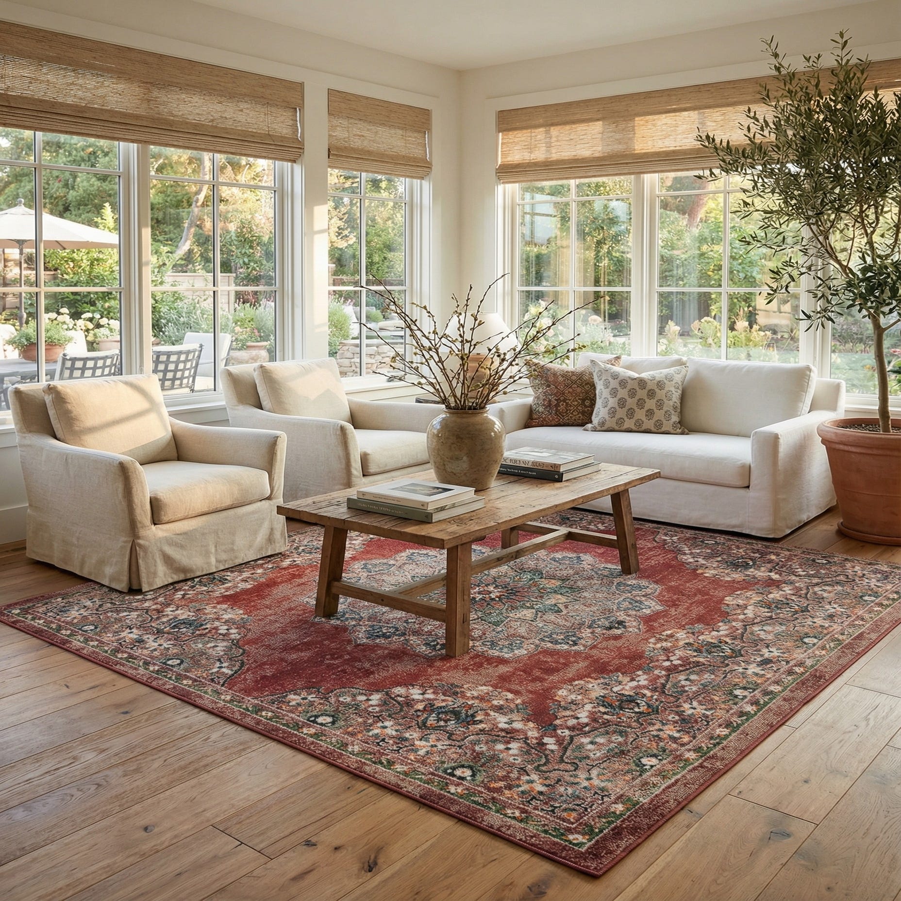 A square 8'x8' Isabella Collection rug with a distressed red background, featuring a central medallion and ornate traditional floral patterns in blue, green, and cream.