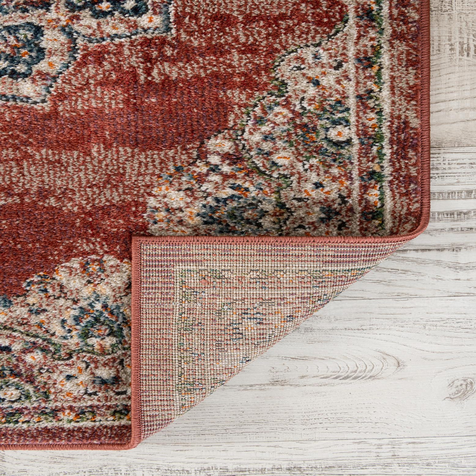 Primary color is Antique Red. Colors in this rug include: Antique Red, Beige, Black, Blue, Green, Ivory, Light Blue, Red, Orange.
