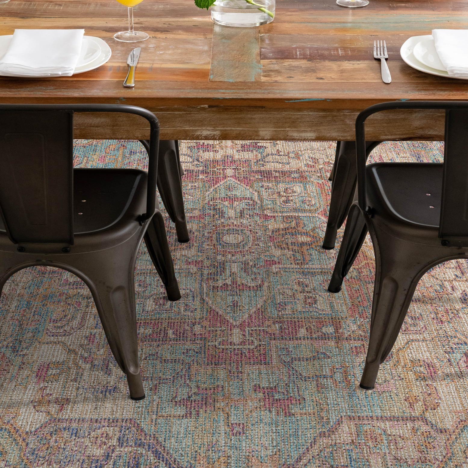 A 2x3 rectangular Chenille Jute rug featuring a faded traditional medallion pattern in blues, reds, and natural tones.