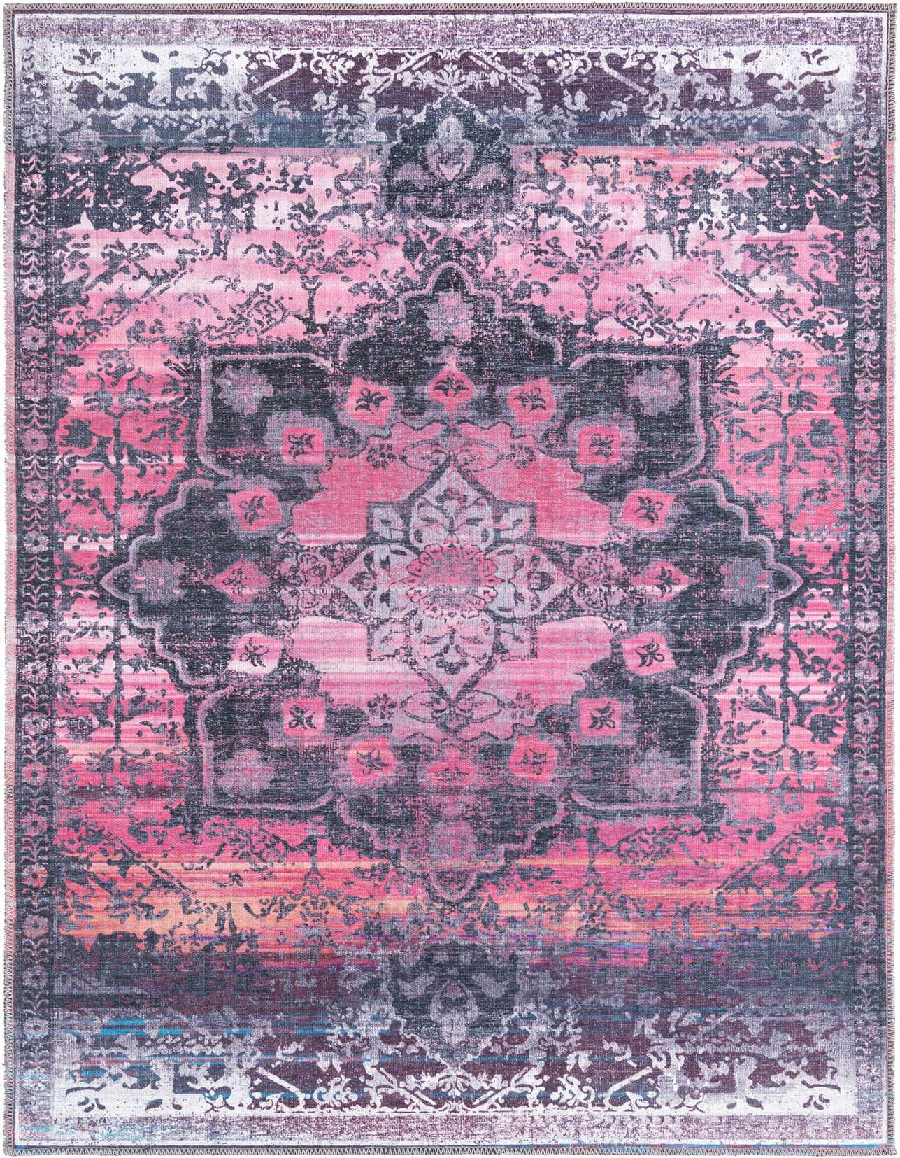 Primary color is Antique Rose. Colors in this rug include: Antique Rose, Black, Blue, Orange, Ivory, Gray, Pink.