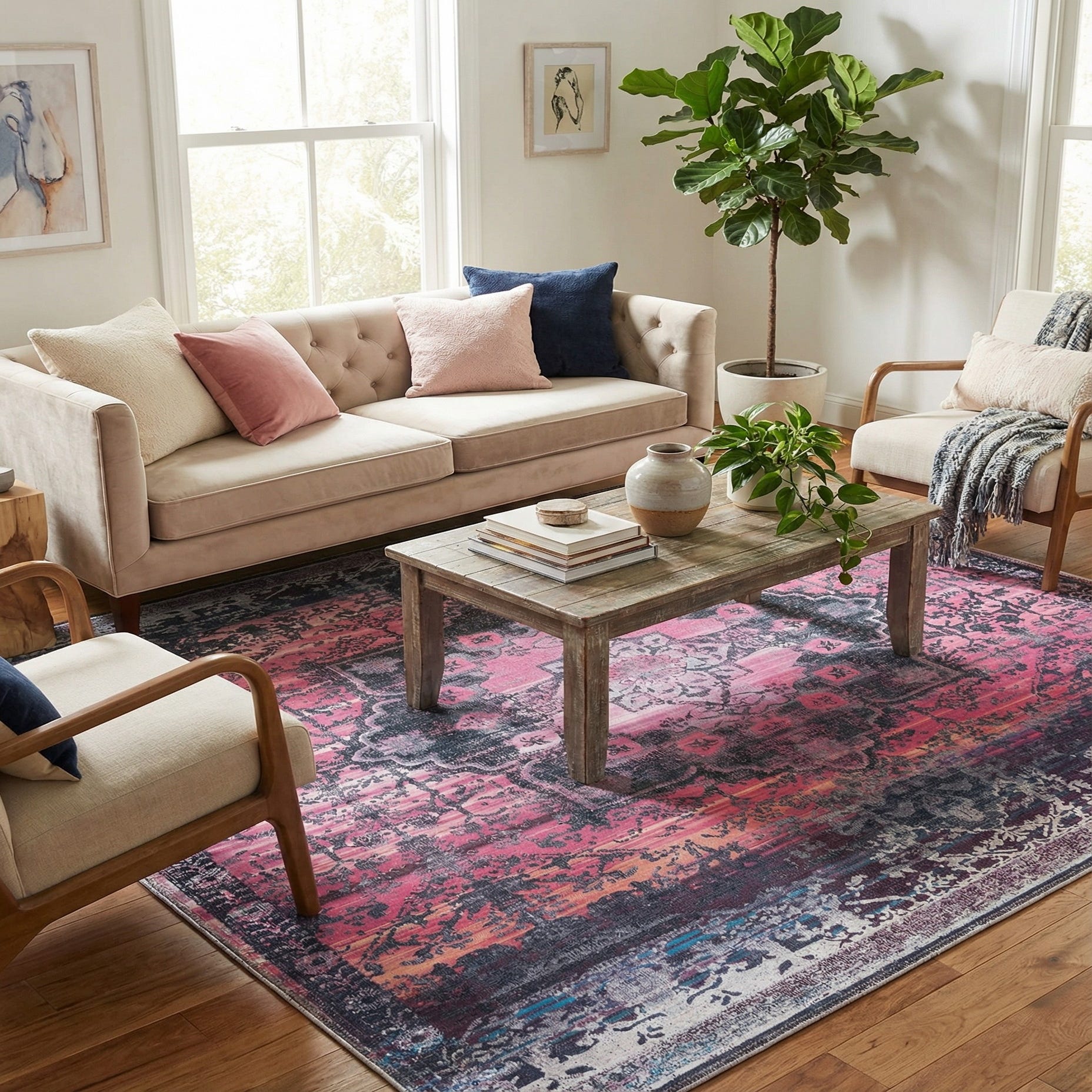 This rug fits well in modern-bohemian, eclectic, or transitional interiors—use it to anchor a sofa-and-coffee-table arrangement, soften hardwood floors in a bedroom, or sit beneath a round dining table to introduce color and pattern. The warm Antique Rose pairs easily with neutral upholstery and wood tones, while the Black and Gray motifs coordinate with matte metals or darker furniture finishes; Blue and Ivory accents make it simple to layer in soft textiles and pillows for a cohesive look.