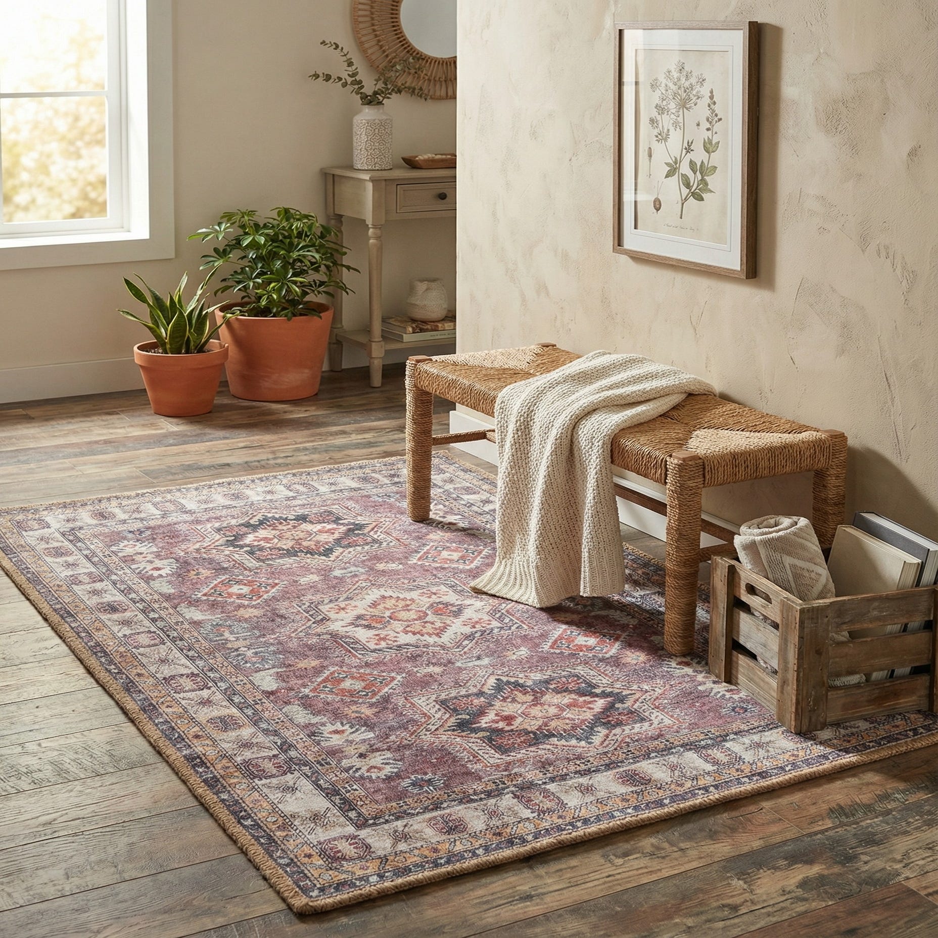 This piece works well in transitional and vintage-inspired interiors: place it beneath a small seating group to introduce layered color, at the foot of a bed to warm a bedroom, or in an entryway to set a welcoming tone. Pair it with warm wood furniture and navy or ivory textiles to highlight the rug’s richer tones, or use it to soften clean-lined modern pieces with its antique-rose background and subtle patterning.